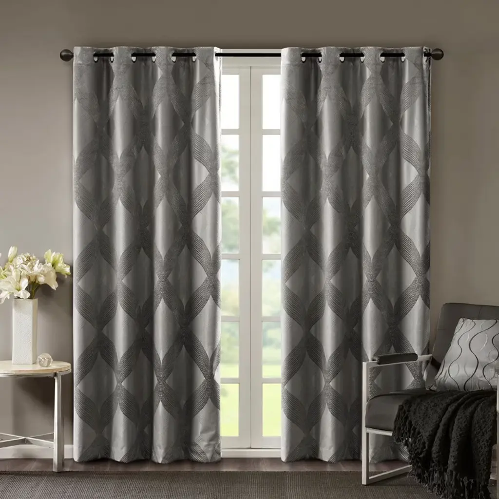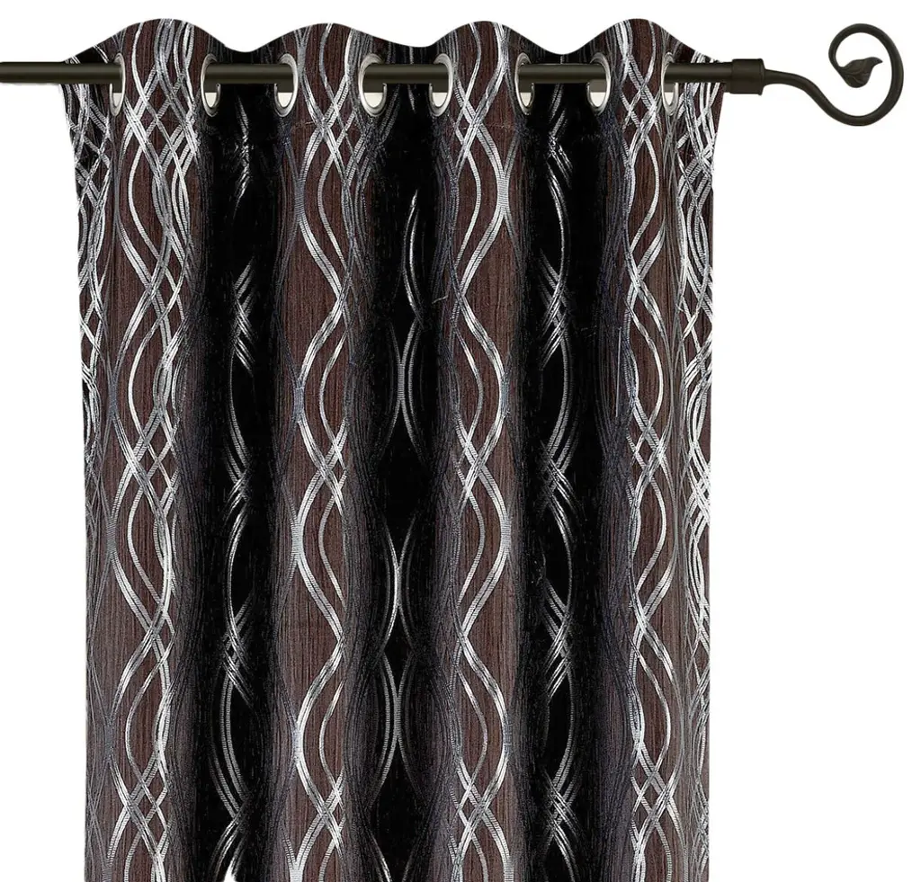 Transform any room of your house with our Silver Jacquard Pattern Grommet top window curtain Panels in either Dark Chocolate or Blue. The highlight of this drapery is the stylish Silver Color Jacquard Pattern woven in must have colors. this curtain panels features Silver metal grommets sewn at the top of each panel. Designed for a look of elegance, the grommets are spaced in such a way that the drapery forms neat pleated gatherings when left partially open.Royal Tradition Collection100% Polyester Window Curtains.Sold in pairs (each package contains two panels)Abstract Jacquard Textured Grommet-Top Panels8 Grommet Per PanelEach panel wide 52" / 104" wide pairAvailable in 4 lengths: (63", 84", 96", & 108")Machine washableAvailable Sizes Include:104" W x 63" L Pair (52" W X 63" L Each)104" W x 84" L Pair (52" W X 84" L Each)104" W x 96" L Pair (52" W X 96" L Each)104" W x 108" L Pair (52" W X 108" L Each)