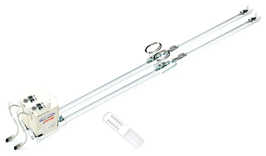 The track system is slim and compact with a space saving design, but is still very strong ? it can support curtain loads up to 100 lbs. Stainless steel cable drive system will last a lifetime. Built in overload protection is safe and reliable. Integrated clutch system releases the drive head when the motor is not running, so it will save power and make it easy to manually open/close the curtain with just a finger. 12VDC drive engine runs quietly and can be powered by 12V battery when power is not available. Battery pack is not included.METechs curtain motors are truly a core part of your home automation or smart home. Built in third party controlling interface makes it easy to integrate into other controllers, like METechs Smart Home Hub, Control 4, PLC, Insteon, Zigbee, Z-Wave, X10, and others. It can be controlled by remote (included), control pad (included), wall switches, METechs timers, third party controllers, and smart phones and tablets with add-on module. It can also be controlled with your existing universal learning remote, like Logitech remote, X10 remote, and other universal remotes.Curtains can be setup to open/close from left to right, right to left, or center to both sides. Motor can be mounted on the left or right side. A second motor can be added if needed and will double the power. It can be mounted anywhere on the ceiling, or on the wall with adjustable off wall distances between 0.25" to 3.5". METechs motorized curtain tracks are designed for a worry free purchase and flexible installation.Order tips: METechs motorized curtain tracks are semi-assembled from the factory with a center open/close orientation; however, left or right orientation can be changed easily during installation. The track can be cut down to fit the measurements of your project, just order the next longer size track than you need. Mount hardware and remote control are included in the package; this is a ready to go kit! Curtains or drapes are not included.FeaturesOne remote control operates up to 8 sets of units without interfering with each otherOpen/close curtain by remote, control pad, hand, smart phone with METechs module, or any other controllerAutomatically stops when curtain is fully open/close without position setupStop at any preferred position by pressing stop Overload protection within 30 secondsOpen/close curtain by hand any time or while power is offSimple and easy DIY installation with screwdriverSafe and reliable design with 12VDC transformer with UL or GS approvalOpen/close from center, left, or rightMotor can be mounted at either left or right endLight, strong, and beautiful aluminum trackWorks with all types of curtain fabrics or draperiesSlim motor is easily hidden behind curtain, it looks no different than a regular manual trackThe track can be cut down to any sizeComes with both wall and ceiling mount hardwareReady to go Kit, but curtain or drapery not includedSpecificationsInput voltage: 120V AC/60Hz or 230V AC/50Hz; UL, CUL approvalOutput voltage: 12V DCOperation power: 12WStandby power: 0.1WTorque: 18.6lbf.in (2.1N.m)Motor speed: 240RPMAverage Running Noise level: 44db (quiet operation)Maximum remote distance: