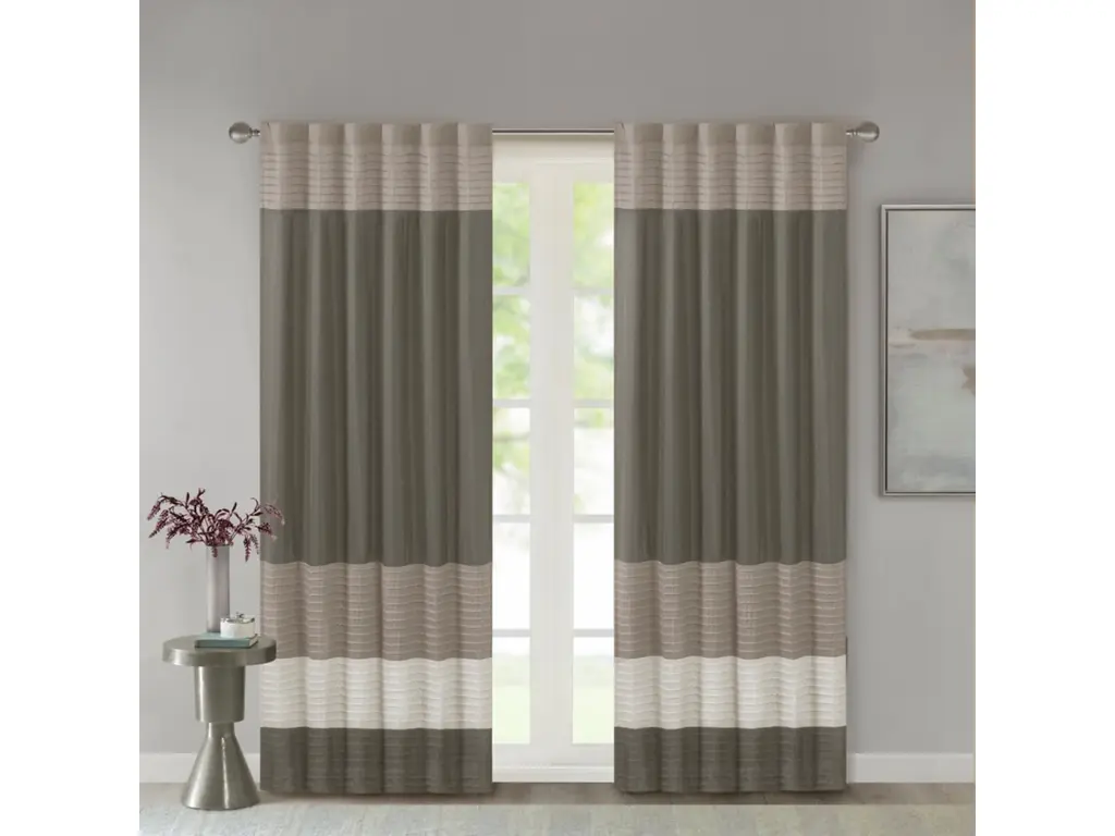 Madison Park Amherst Polyoni Pintuck Window Curtain is a simple way to add style to your room. This window panel features a modern striped design in natural hues of ivory, taupe, and mocha combined with pintuck detailing for beautiful texture and dimension. The added lining helps filter the perfect amount of light and creates fullness for better drapability. Simply hang using rod pocket or with back tabs for a tailored look. This window curtain fits up to a 1.25" diameter rod.