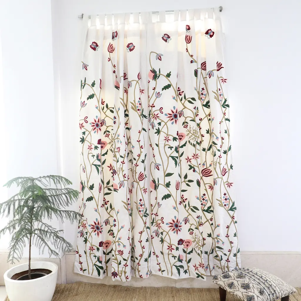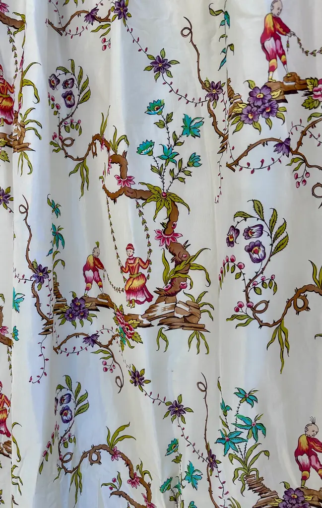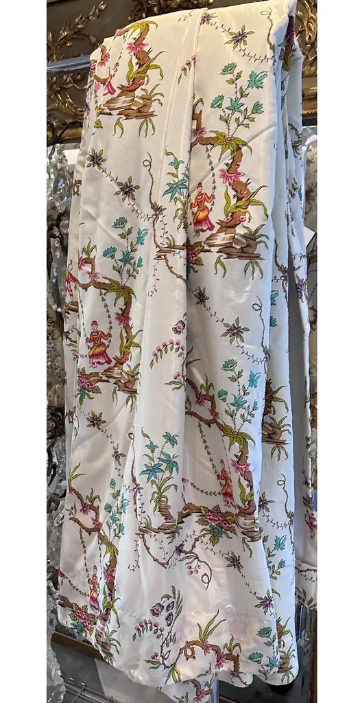 Scalamandre Percale Escarpolette by Charles Burger Silk Ming Toile Drapery Panel 1 of 4 available. Top width 40.5 Bottom width 74.5 Height 89