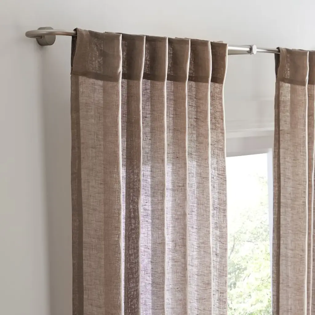 100% European flax in Mocha. Sheer fabric lets lots of light in for sun-filled rooms. Various lengths, all sizes 48"w. Pole pocket diameter: 4.25". 2-in-1 construction with dual hanging options: rod pocket (bunched) or back tabs (pleated). Coordinates with West Elm's window hardware (sold separately). Each curtain panel sold separately. Imagery reflects opacity of curtain when exposed to direct sunlight. Made in a Fair Trade Certified™ factory, empowering workers who made it. Linen woven from European-grown flax, constructed in China. To ensure a proper fit, visit our Curtain Guide.