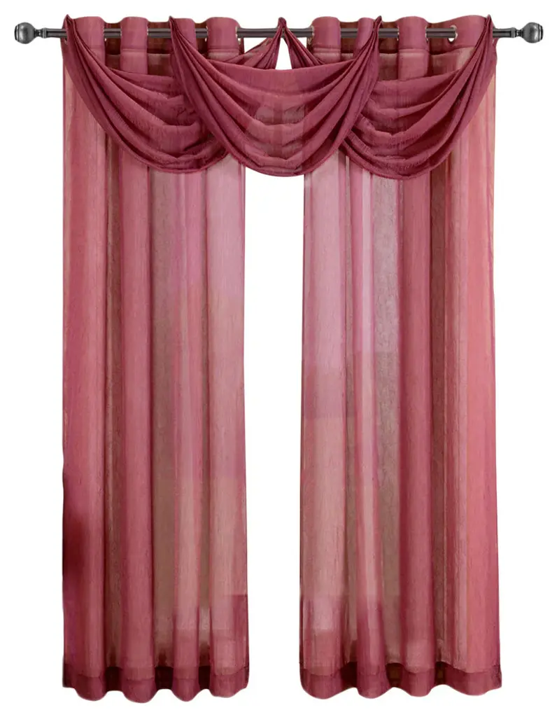 Add more elegance with one or more waterfall valances, use them to dress up a traditional or formal living room or a picture window in your master bedroom. Add the valance scarf to complete the look. Solid valances easily fits into any home decor''s color scheme. Amazingly versatile, these crushed sheer window valances are available in 12 colors. Machine-washable.•100% polyester•Sold as single valance (each set contains only one valance•Allows light to softly enter the room•Crushed sheer creates fresh & rich atmosphere•Machine-washableAvailable Sizes Include: 24" wide x 24" long each