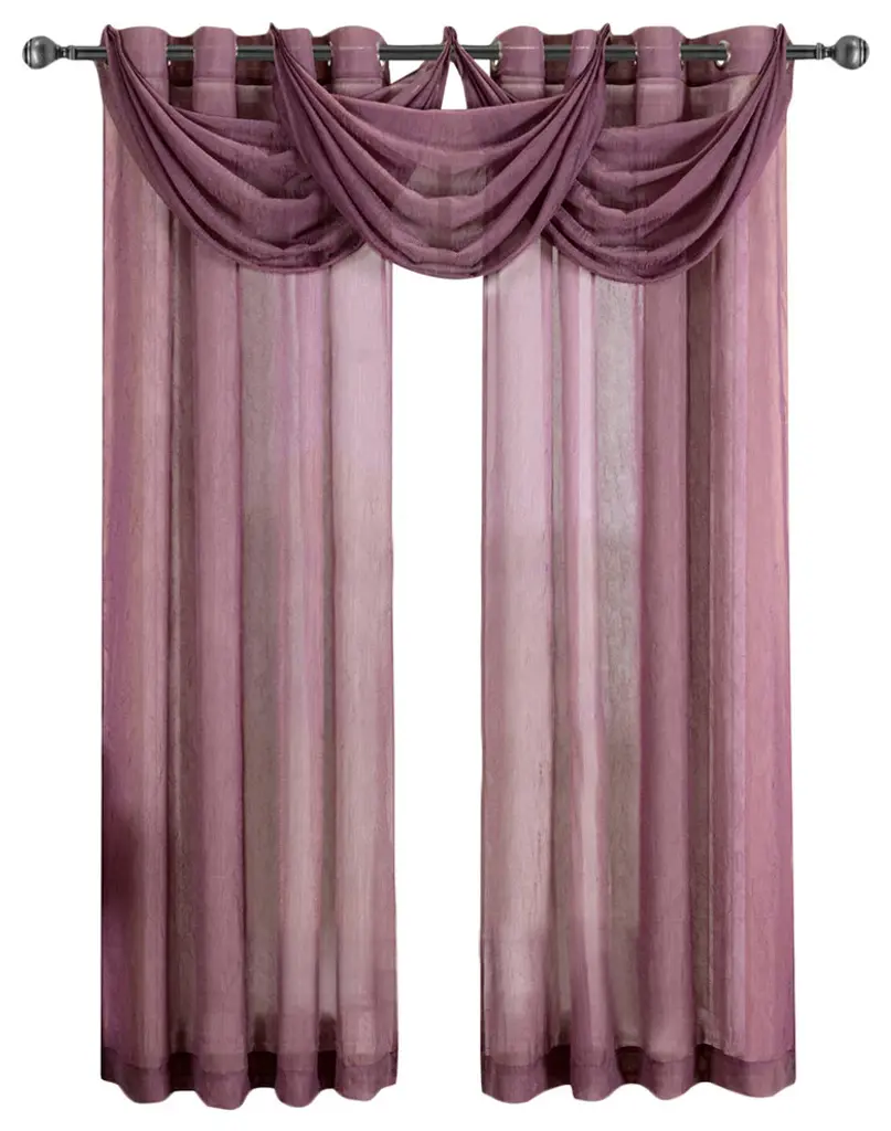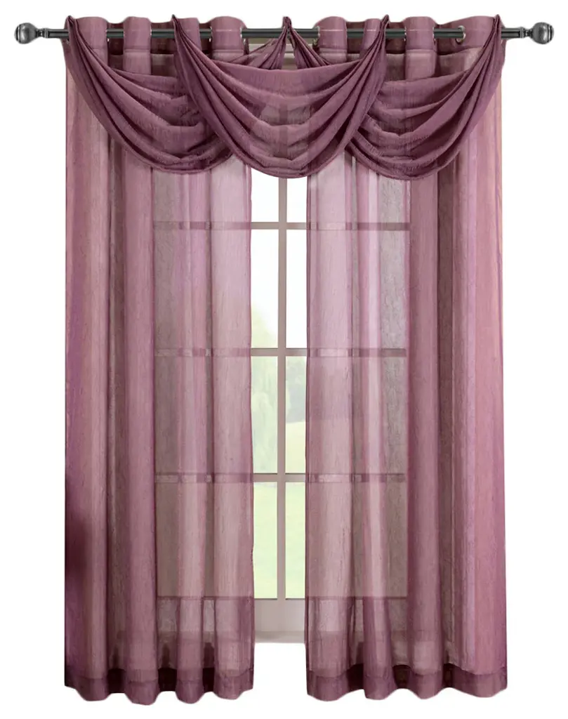 Add more elegance with one or more waterfall valances, use them to dress up a traditional or formal living room or a picture window in your master bedroom. Add the valance scarf to complete the look. Solid valances easily fits into any home decor''s color scheme. Amazingly versatile, these crushed sheer window valances are available in 12 colors. Machine-washable.•100% polyester•Sold as single valance (each set contains only one valance•Allows light to softly enter the room•Crushed sheer creates fresh & rich atmosphere•Machine-washableAvailable Sizes Include: 24" wide x 24" long each