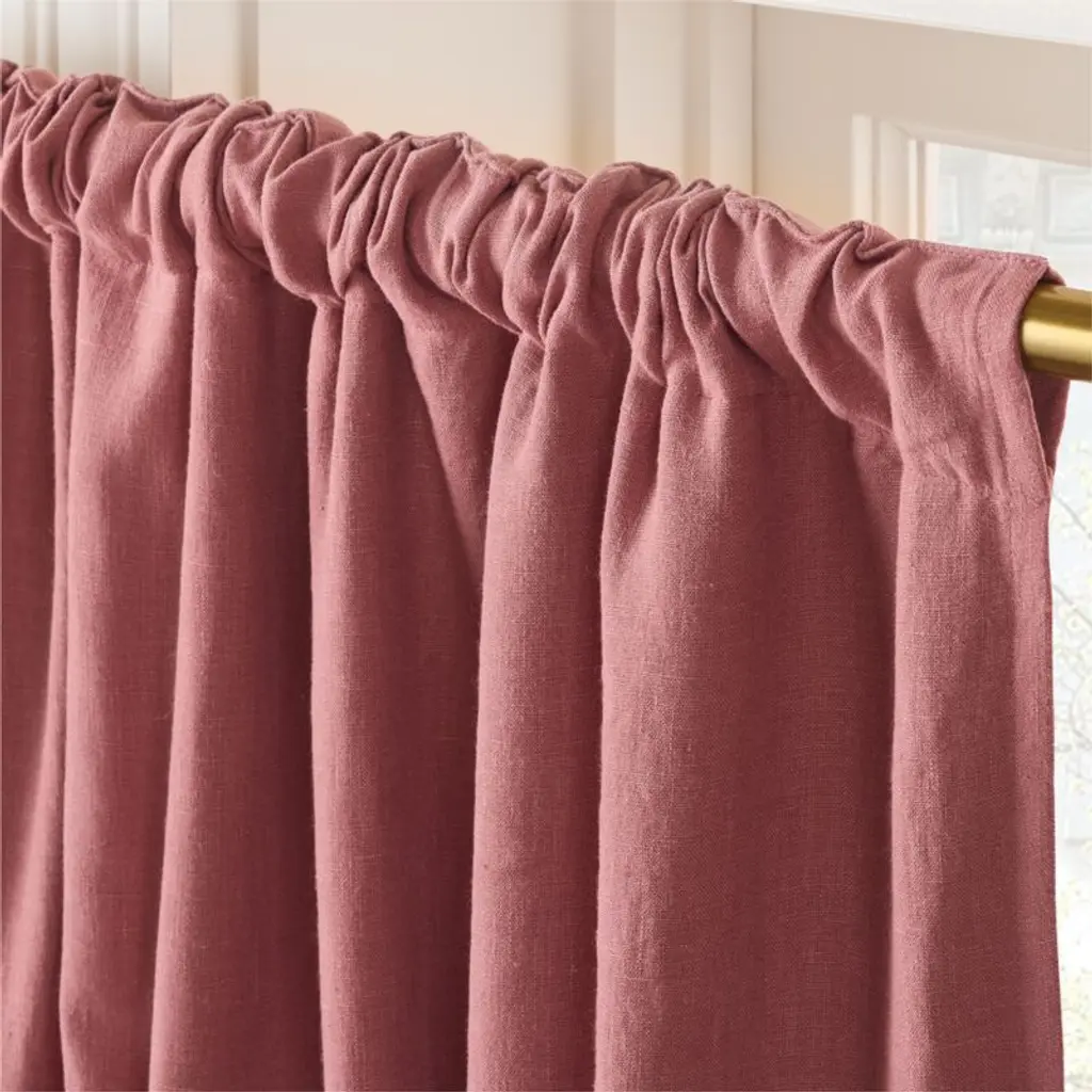 100% pure EUROPEAN FLAX-certified linen curtain panel with polyester lining blocks out light with a fine drape. Full-length and fashion-forward in smoked mauve. Curtain panel flows long to the floor with a blind hem on the seams for a clean, tailored look. CB2 exclusive.