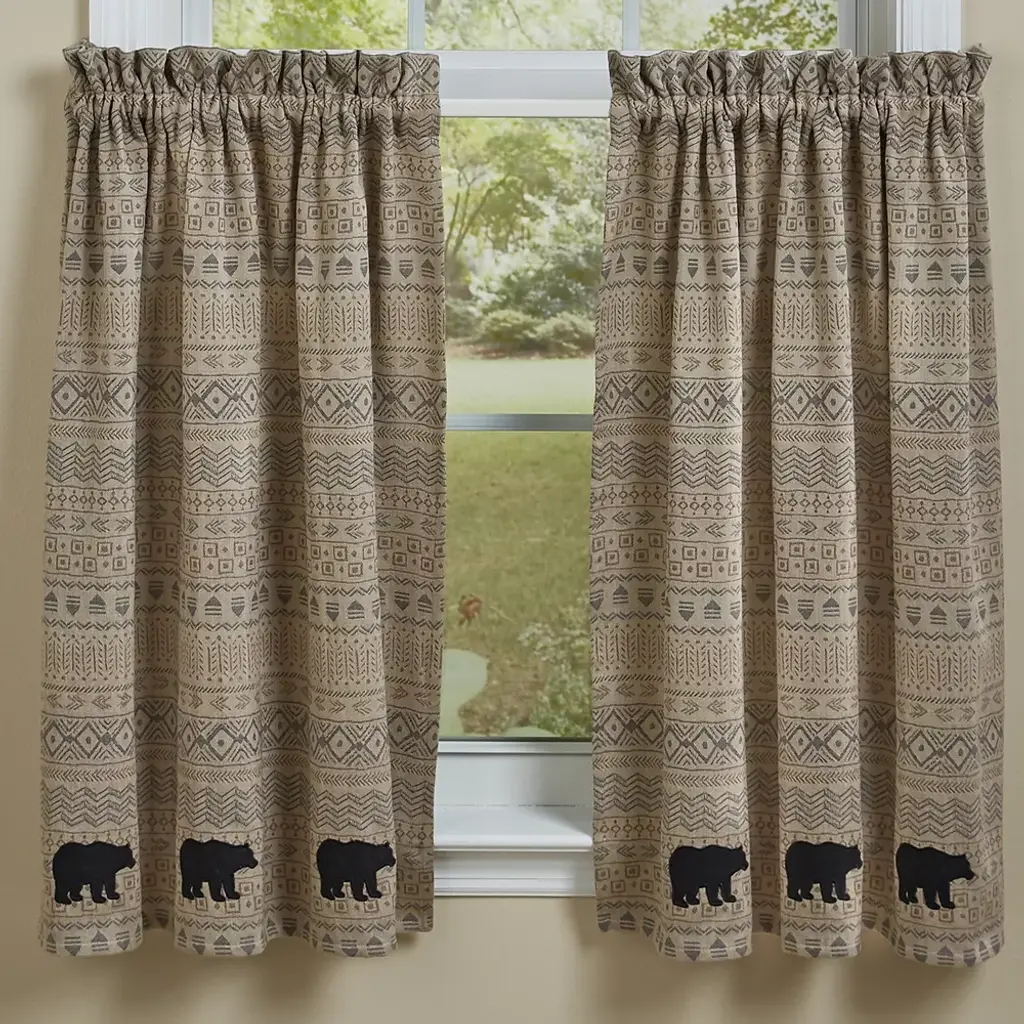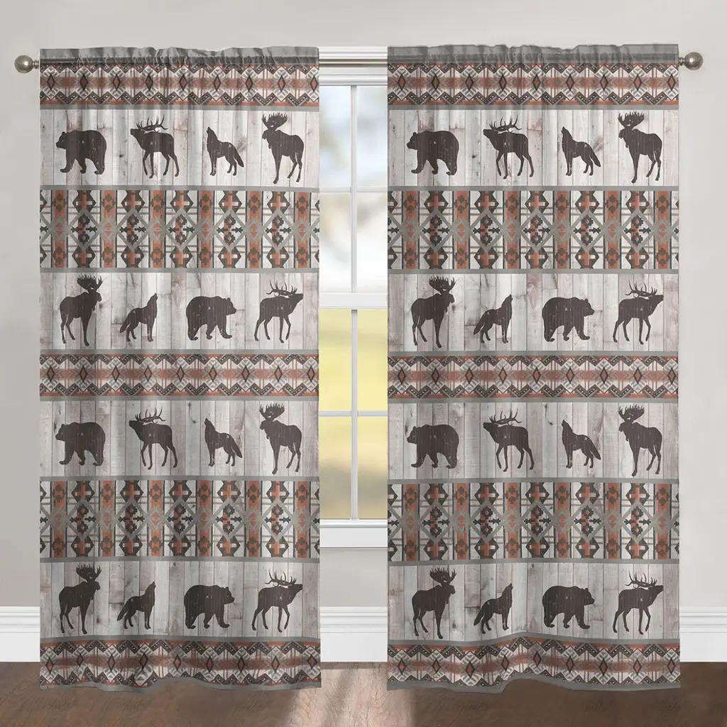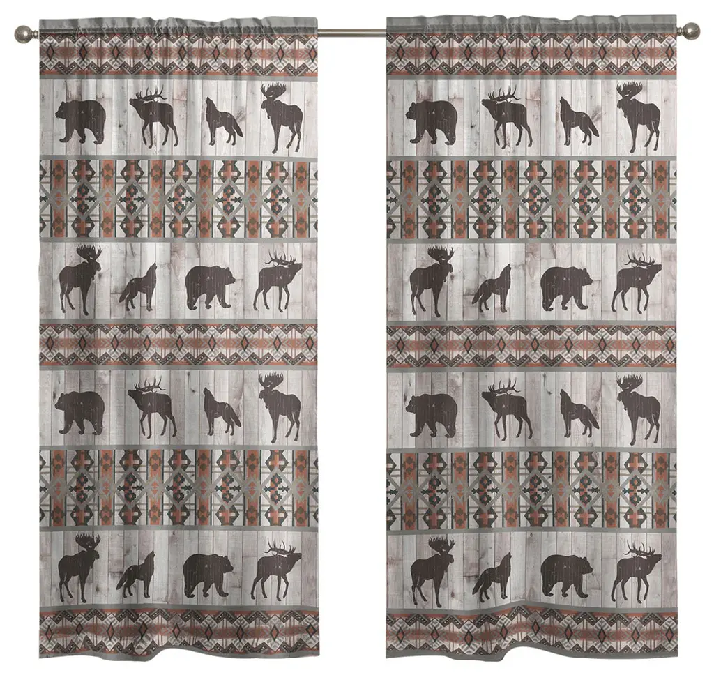 The sophisticated Southwestern pattern and wild animal icons fit perfectly in any lake, lodge or countryside home. The stylish pattern is set on a gray wooden planked background with terra cotta colored accents. Block unwanted sunlight while adding style and elegance to your home. Digitally printed to create crisp and vibrant images. Made of 100% polyester. 3" rod pocket (rod not included). Measures 84"X50". Panels sold individually. Machine washable.