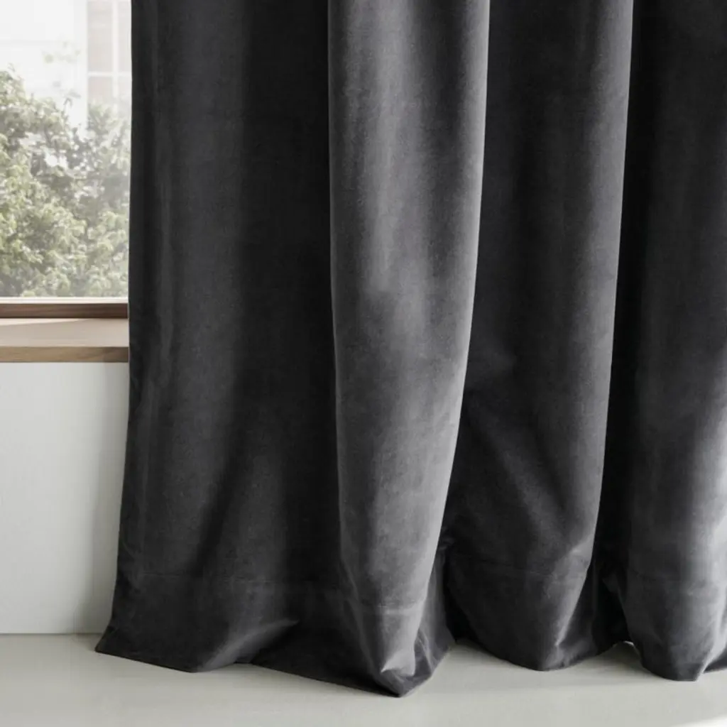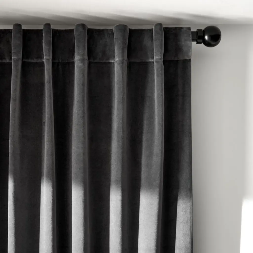 Lush and full-bodied, our cotton velvet curtain dresses up your window in pure luxury. Draping gracefully, the opaque curtain panel brings elegance to the dining room and a soothing softness to the bedroom. Hang our exclusive storm grey velvet curtain panel from the back tabs for an elegant pleated style, use the rod pocket to create a more laid-back gathered look or add a set of our curtain clips (sold separately).Curtain hardware also available.Learn how to hang curtains in our guide.