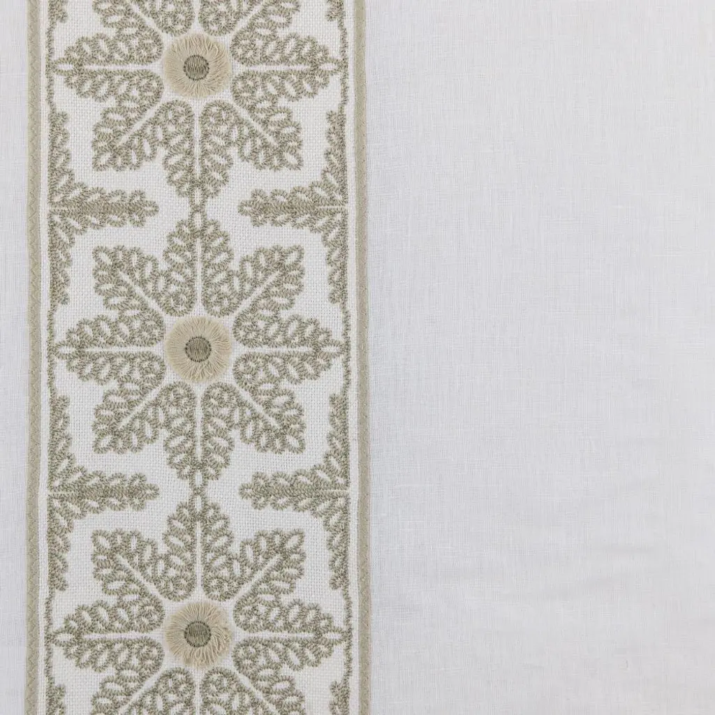 A silver and gray embroidered design beautifully defines the leading edges of the white linen blend drapes. From bedroom to living spaces, these panels deliver beautiful framing or coverage for windows.