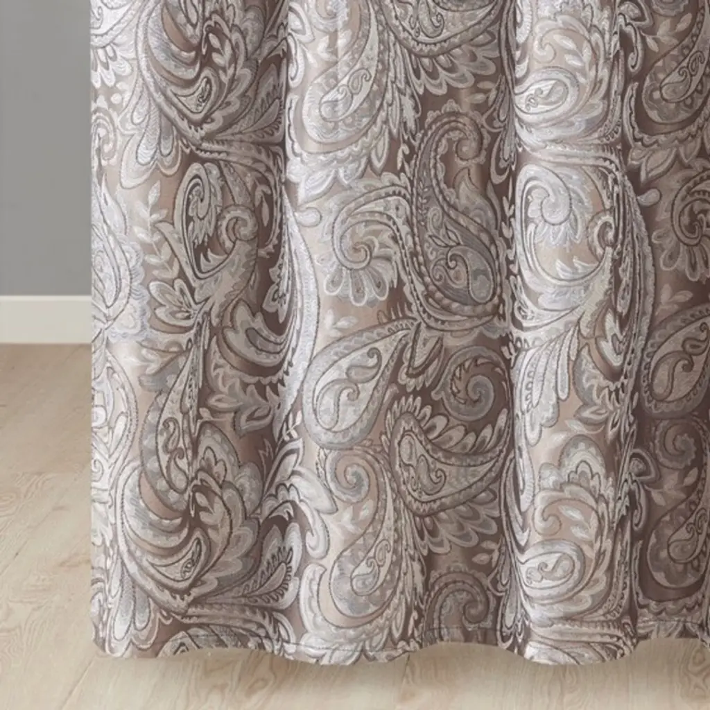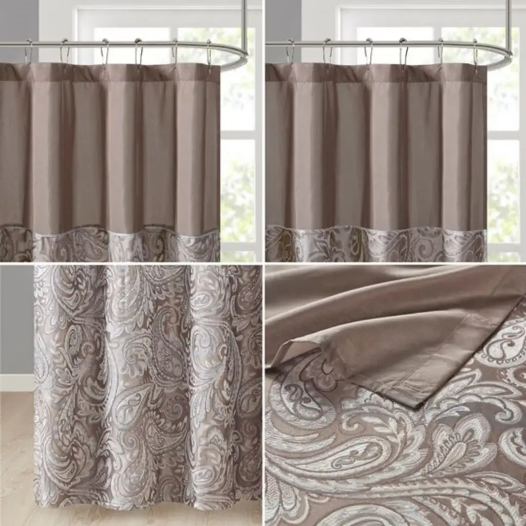 The Madison Park Aubrey Polyester Jacquard Shower Curtain creates a sophisticated modern look in your bathroom. The pieced design flaunts a beautiful woven jacquard in an updated paisley motif with a large solid stripe at the top of the shower curtain. This jacquard shower curtain is machine washable for easy care. Complete the collection and look with coordinate bath towels, bath rugs, bedding, window, and dec pillow - available and sold separately.