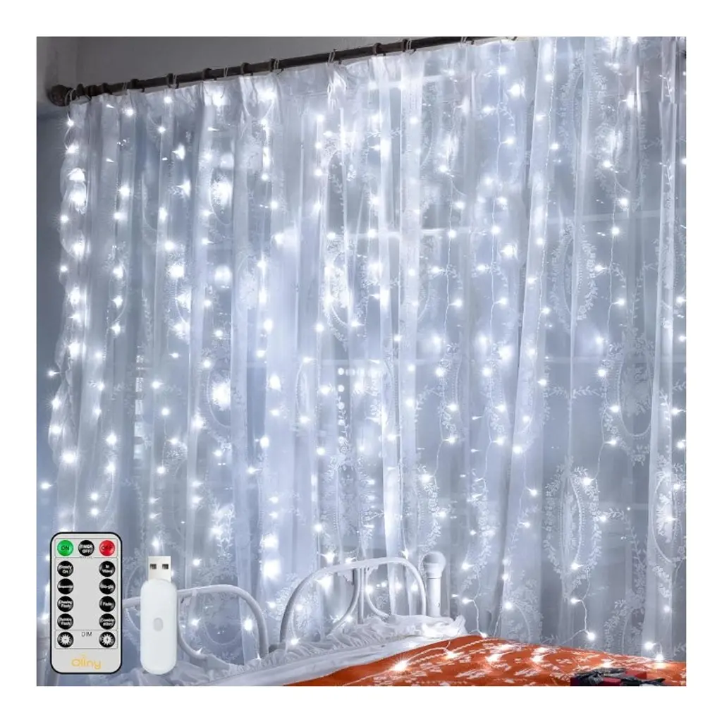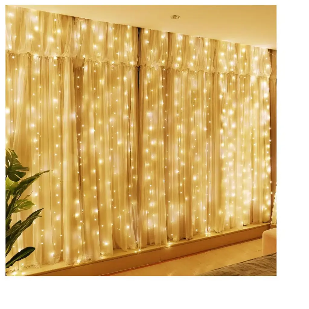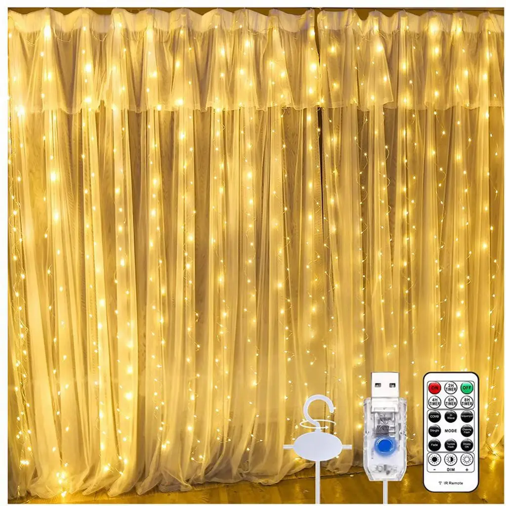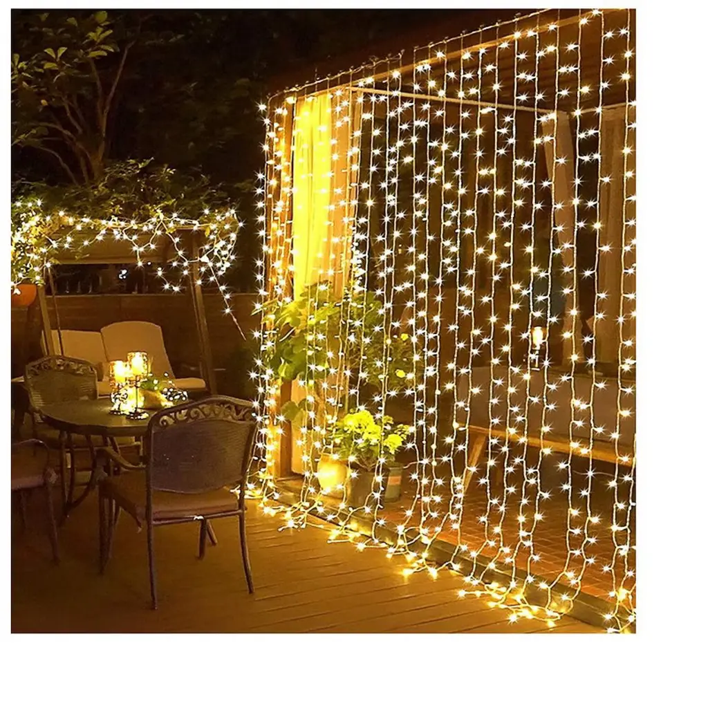 These LED icicle light decoration creates a show-stopping display that leaves passersby in awe. Add a cascading backdrop to your outdoor display with these 17 strands that each contain 18 warm white lights. Pull back either side to give the elegant illusion of open curtains. The included control box has 8 different settings. PVC and plastic. Settings include: - Combination - Waves - Sequential - Slo-glo - Chasing/flash - Slow fade - Twinkle/flash - Steady on. 121"W x 115"L, with a 119" long lead wire