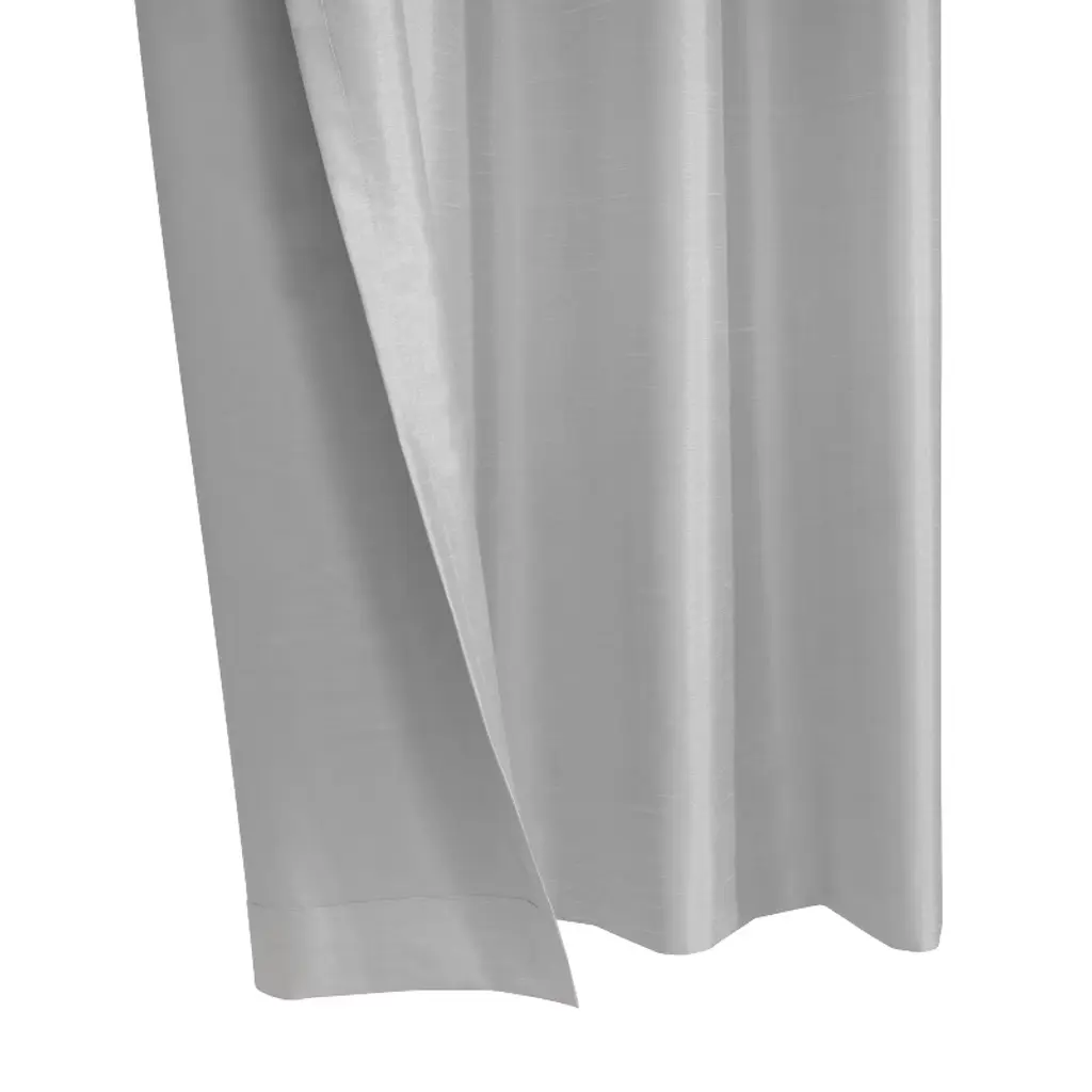 The Habitat Glacier Blackout Grommet Curtain Panel in Silver, available in sizes 52 x 63, 52 x 84, 52 x 95, and 52 x 108 inches, offers a luxurious silk-like polyester fabric with a TPU backing that ensures 100% total blackout while allowing natural air circulation. Perfect for living rooms, bedrooms, or home offices, these curtains combine elegant design with superior functionality. The smooth fabric enriches any decor style from modern to traditional. When properly installed, they block all incoming light, providing a true blackout experience. Durable metal grommets enable easy hanging and smooth sliding on curtain rods. These panels balance temperature, reduce noise, protect from UV rays, and are machine washable for convenient care.