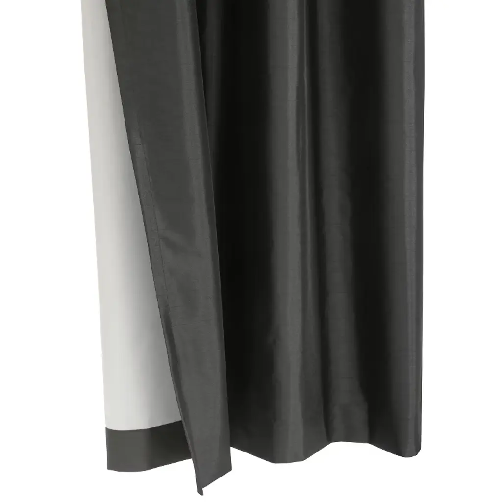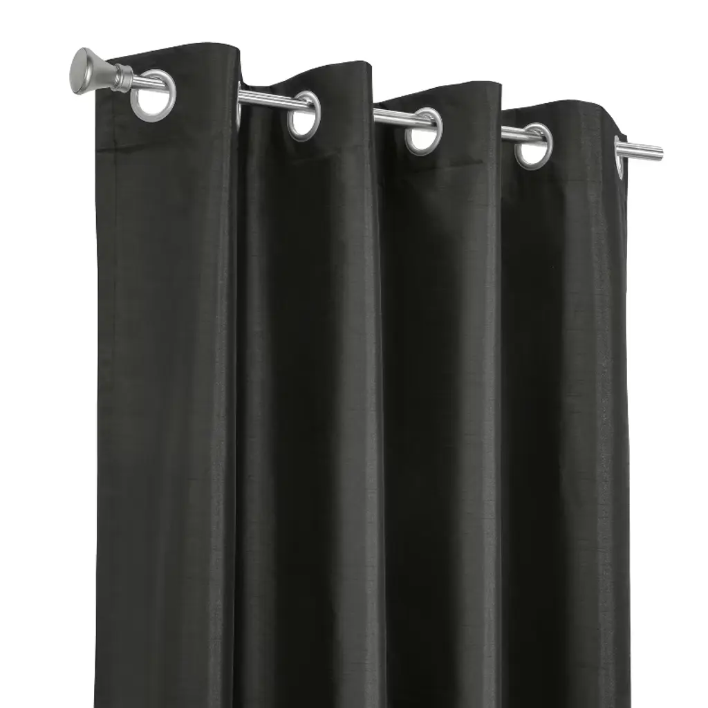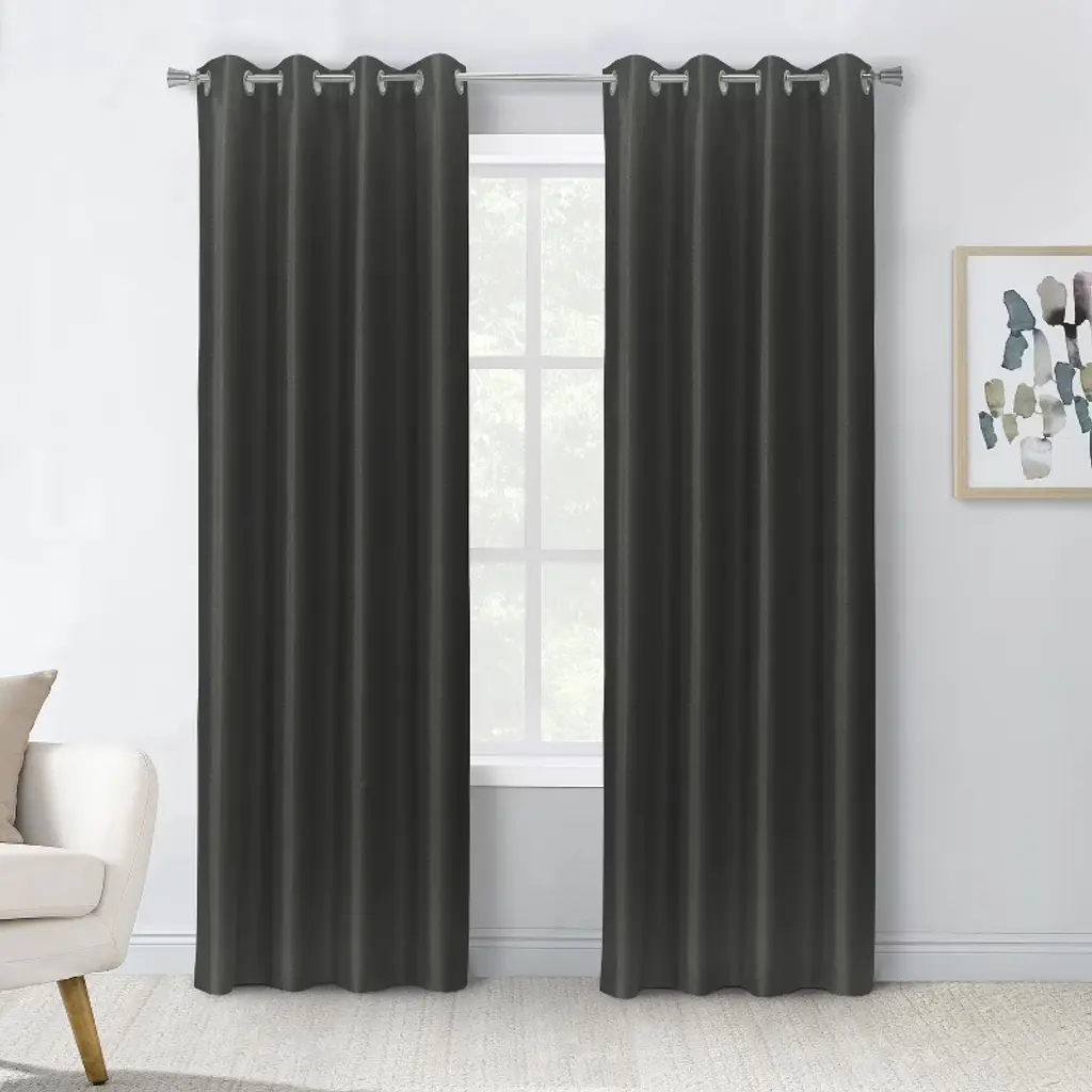 The Habitat Glacier Blackout Grommet Curtain Panel in Black, available in sizes 52 x 63, 52 x 84, 52 x 95, and 52 x 108 inches, offers a luxurious silk-like polyester fabric with a TPU backing that ensures 100% total blackout while allowing natural air circulation. Perfect for living rooms, bedrooms, or home offices, these curtains combine elegant design with superior functionality. The smooth fabric enriches any decor style from modern to traditional. When properly installed, they block all incoming light, providing a true blackout experience. Durable metal grommets enable easy hanging and smooth sliding on curtain rods. These panels balance temperature, reduce noise, protect from UV rays, and are machine washable for convenient care.