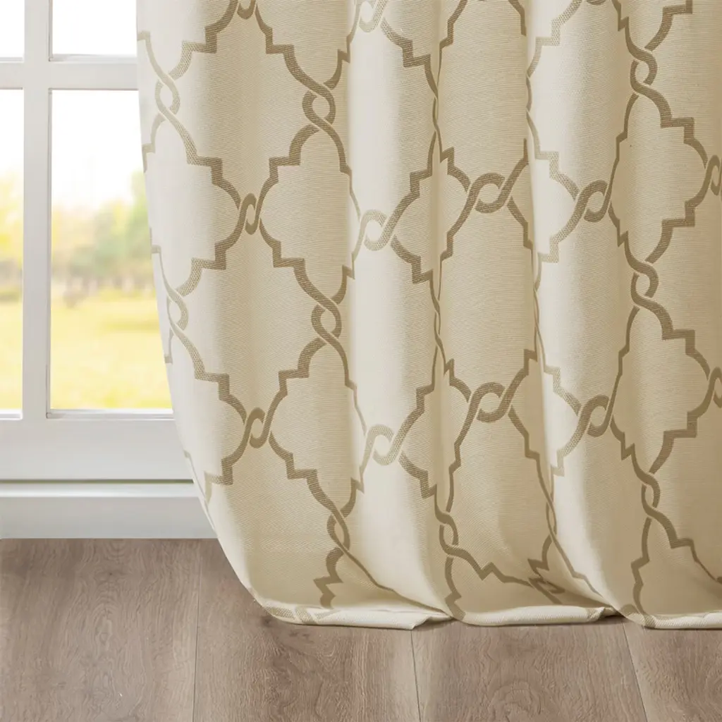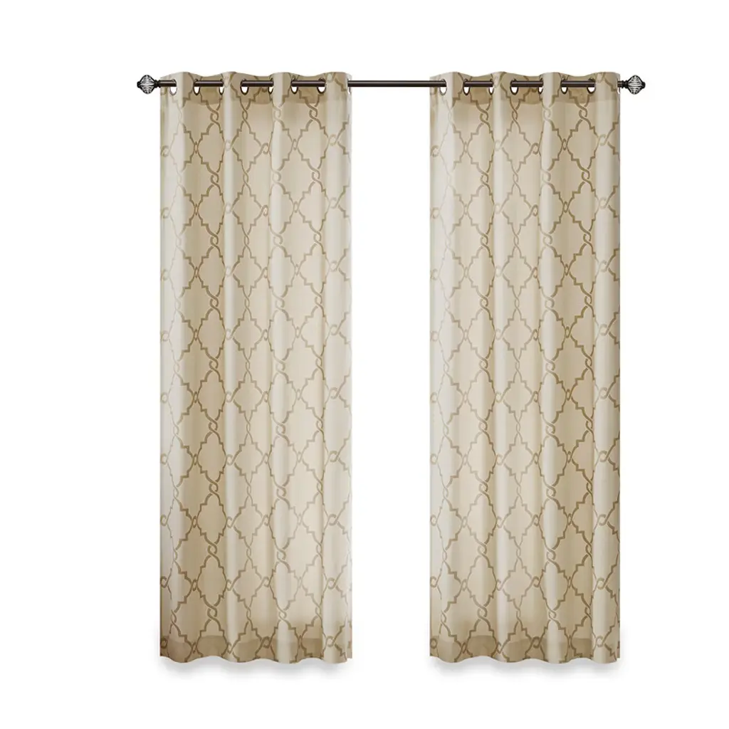 The Madison Park Saratoga Fret Print Panel is the perfect addition for a casual and stylish update to your home decor. This window panel features a trendy metallic gold fretwork on a soft beige ground, creating a simple yet modern look. The cotton blend basket weave fabric softly filters the perfect amount of sunlight into your home, while providing texture for natural appeal. Gunmetal grommet top detail makes this panel easy to hang, open, and close throughout the day. Fits up to a 1.25" diameter rod. Pattern position may vary per panel due to random cutting of fabric. Product Details 50x84" 1 Window Curtain:50x84" Material 68% poly 29% cotton 3% rayon; basket weave print, Grommet Top