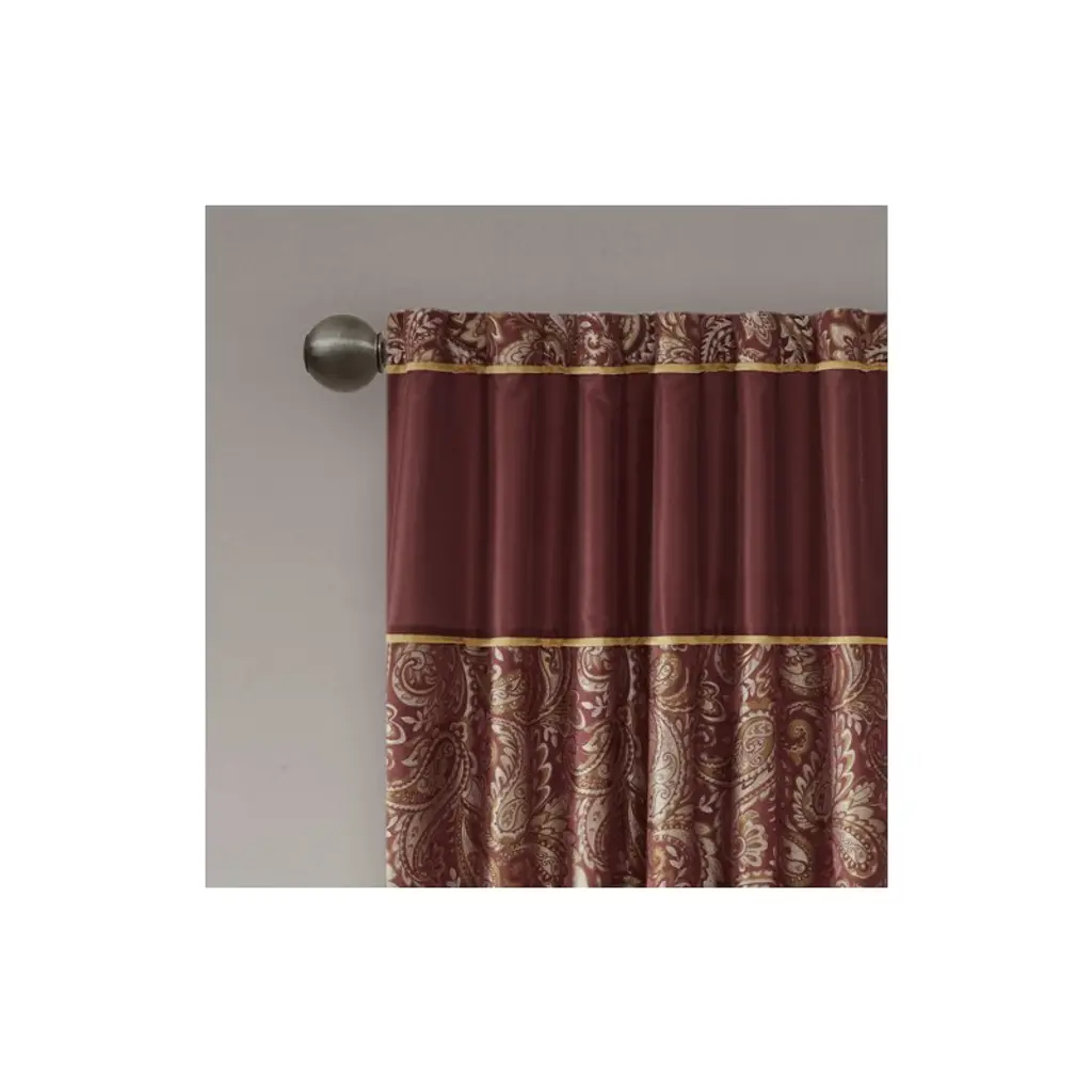 Description For a luxuriously classic style, our Madison Park Aubrey Window Curtain Pair is the perfect touch to your decor. The alluring jacquard weave is inspired from an updated paisley motif and is woven in beautiful hues of burnt red, gold, and a hint of platinum for a shimmering accent. The window panels are pieced with solid faux silk and beautiful flat piping details in gold, creating an elegant look. While also achieving the OEKO-TEX certification, meaning it does not contain any harmful substances or chemicals, ensuring quality comfort and wellness. Rod pocket or back tabs top finish makes this curtain easy to hang, open, and close panels throughout the day; while fitting up to a standard 1.25" diameter rod. Coordinating bedding is also available and sold separately. Product Details 50x108" 2 Window Panels:50"W x 108"L (2) Material 100% polyester, rod pocket and back tabs