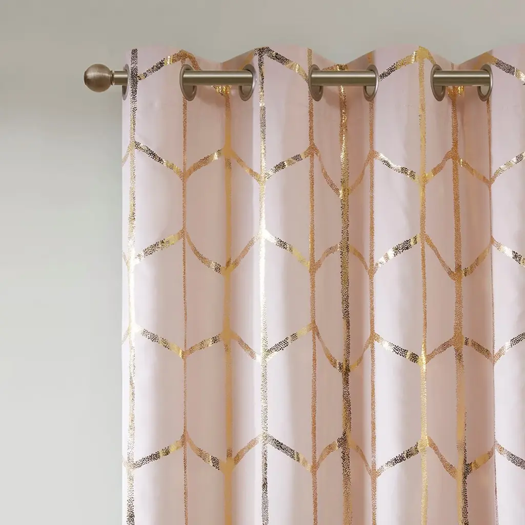 Description Freshen up your space with the enchanting style of Intelligent Design Raina Window Panel. The stunning panel flaunts a geometric, metallic gold print against a light Red ground for a fun and eye-catching look! Finished with a heavy 3 pass foamback liner, this panel is 100% total blackout providing energy efficiency and added privacy. Grommet top makes this panel easy to hang, open, and close through the day. Machine washable for easy care; complete the collection with coordinating bedding and shower curtain sold separately. Product Details 50x84" 1 Window Panel:50"W x 84"L Material microfiber with 3pass liner