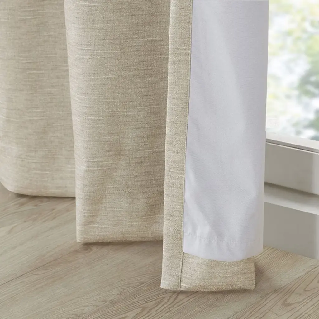 This blackout curtain pair flaunts a tonal ivory hue on a faux silk textured fabric that creates a beautiful and rich modern look. Also achieving the OEKO-TEX certification, these curtains do not contain any harmful substances or chemicals ensuring quality comfort and wellness. Each panel features a heavyweight light grey foamback on the reverse making it 100% total blackout, blocking out all outside light, noise, and intrusion for the highest level of privacy. Using thermal technology, the total blackout curtain also helps provide maximum energy savings by keeping your room the perfect temperature throughout the year. Easily hang, open, and close panels throughout the day with the silver grommet top finish; this total blackout window panel pair is perfect for use in bedrooms, media rooms, or any private space providing a pitch black ambiance lighting level when curtains are fully closed.