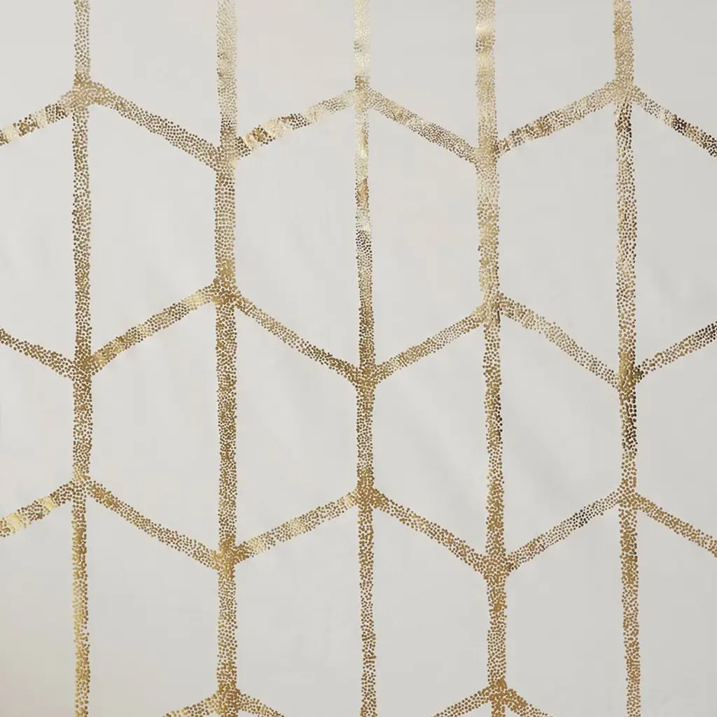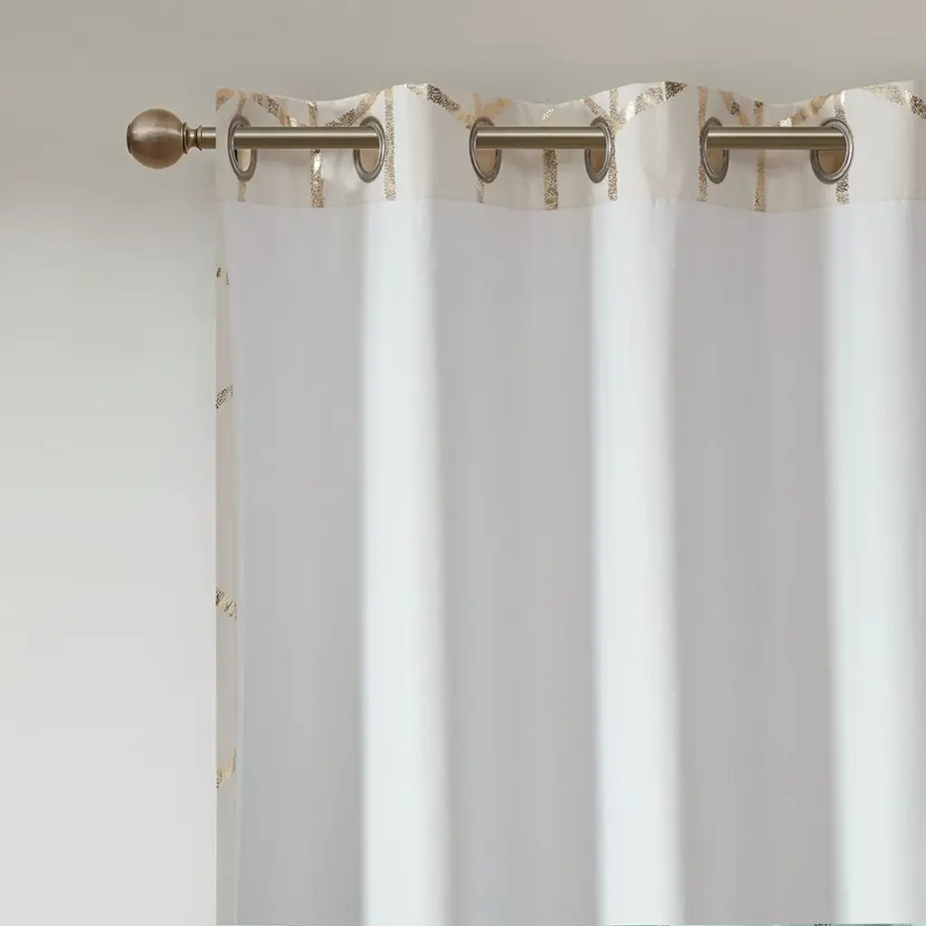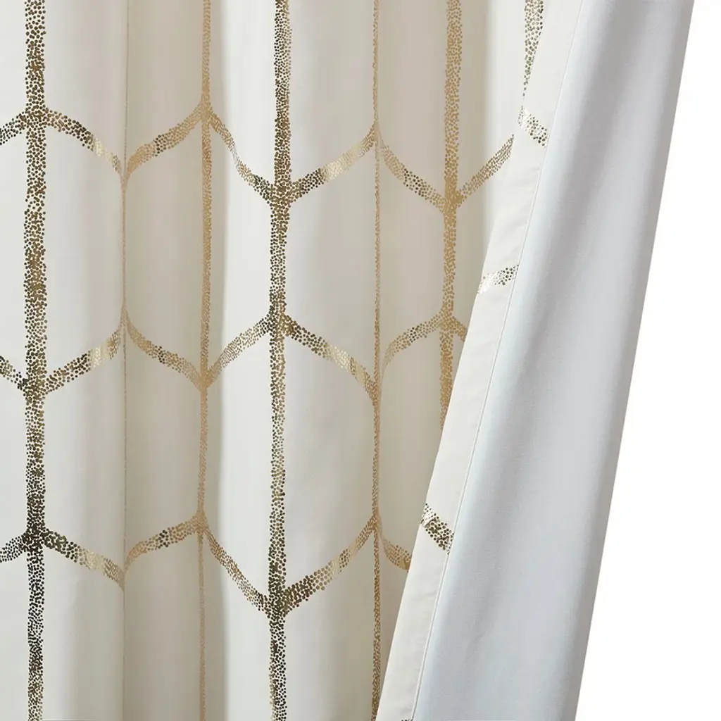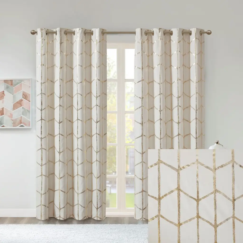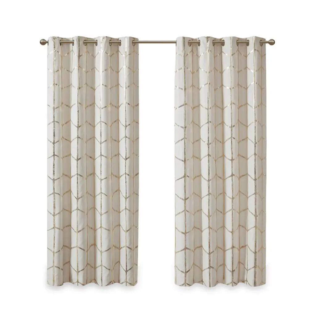 Description Freshen up your space with the enchanting style of Intelligent Design Raina Window Panel. The stunning panel flaunts a geometric, metallic gold print against a soft ivory ground for a fun and eye-catching look! Finished with a heavy 3 pass foamback liner, this panel is 100% total blackout providing energy efficiency and added privacy. Grommet top makes this panel easy to hang, open, and close through the day. Machine washable for easy care; complete the collection with coordinating bedding and shower curtain sold separately. Product Details 2-PK 50x84in 2 Panels:50inW x 84inL (2) Material metallic microfiber with 3pass liner