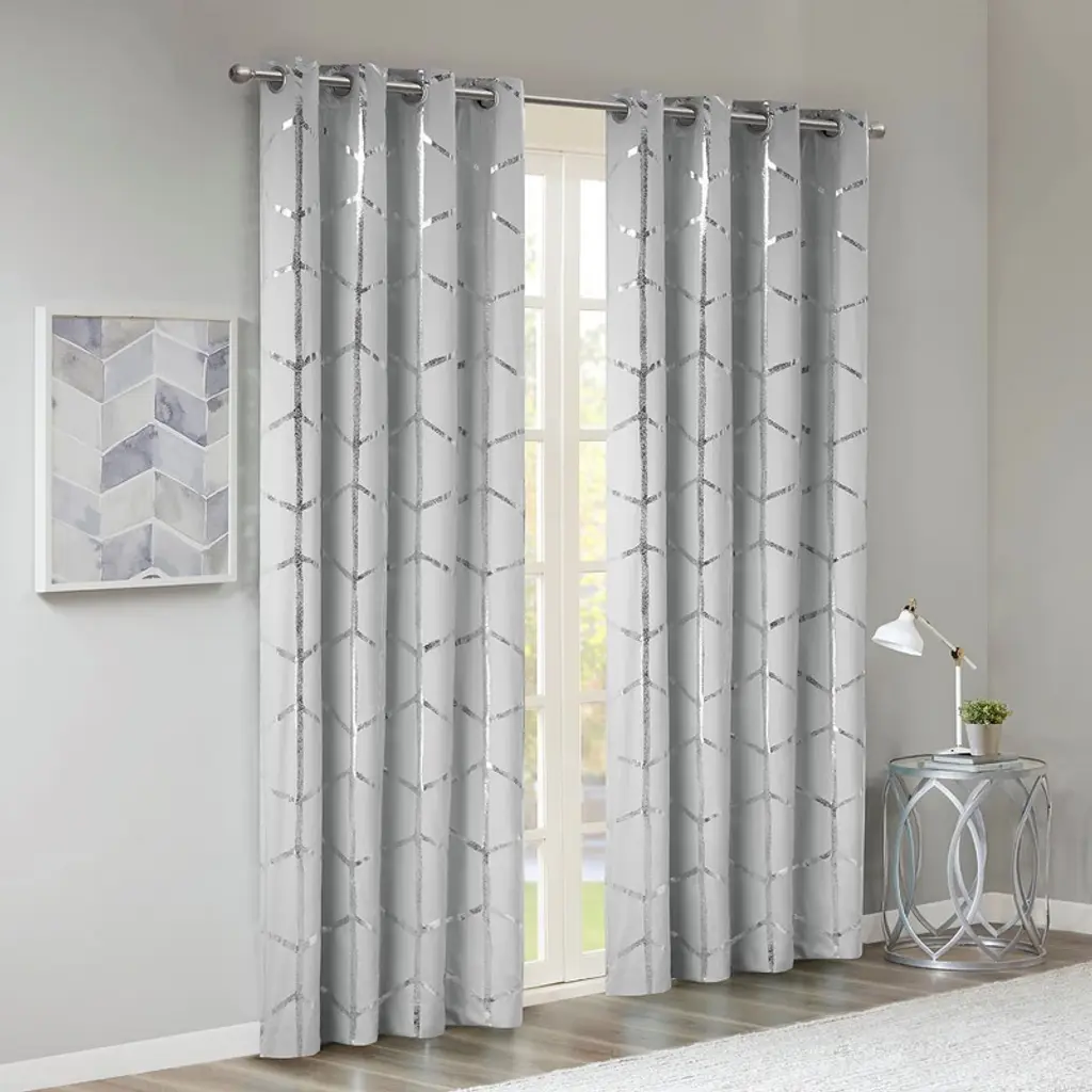Description Freshen up your space with the enchanting style of Intelligent Design Raina Window Panel. The stunning panel flaunts a geometric, metallic silver print against a light grey ground for a fun and eye-catching look! Finished with a heavy 3 pass foamback liner, this panel is 100% total blackout providing energy efficiency and added privacy. Grommet top makes this panel easy to hang, open, and close through the day. Machine washable for easy care; complete the collection with coordinating bedding and shower curtain sold separately. Product Details 2-PK 50x84" 2 Panels:50"W x 84"L (2) Material metallic microfiber with 3pass liner