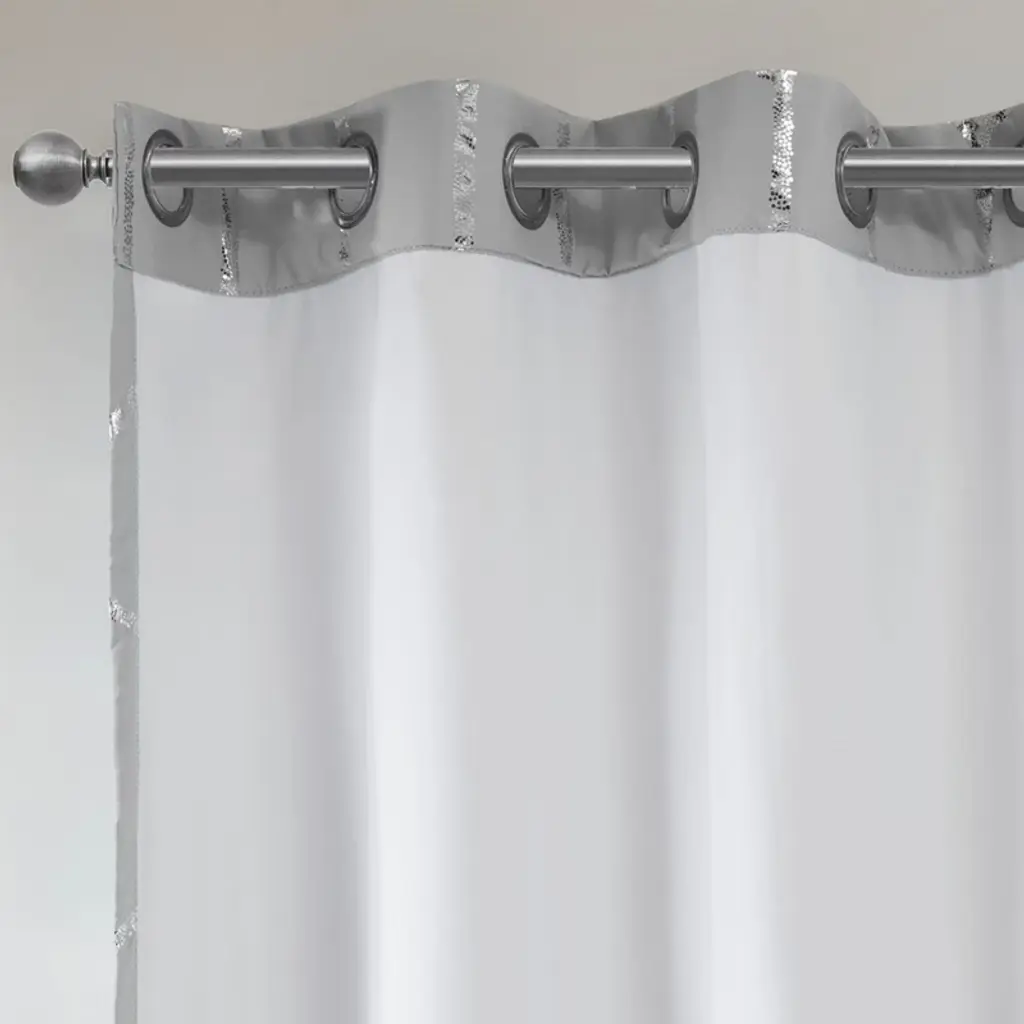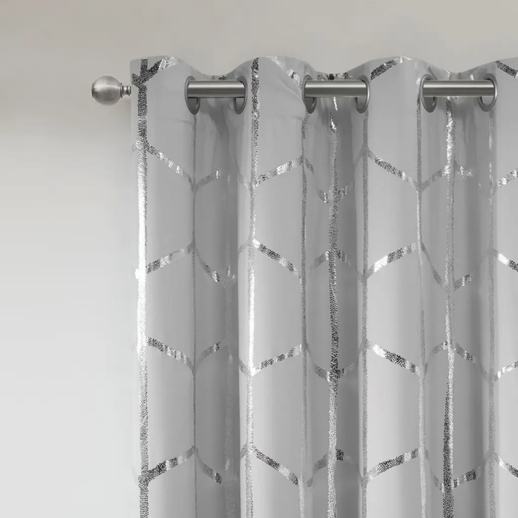 Freshen up your space with the enchanting style of Intelligent Design Raina Window Panel. The stunning panel flaunts a geometric, metallic silver print against a vibrant aqua ground for a fun and eye-catching look! Finished with a heavy 3 pass foamback liner, this panel is 100% total blackout providing energy efficiency and added privacy. Grommet top makes this panel easy to hang, open, and close through the day. Machine washable for easy care; complete the collection with coordinating bedding and shower curtain sold separately.