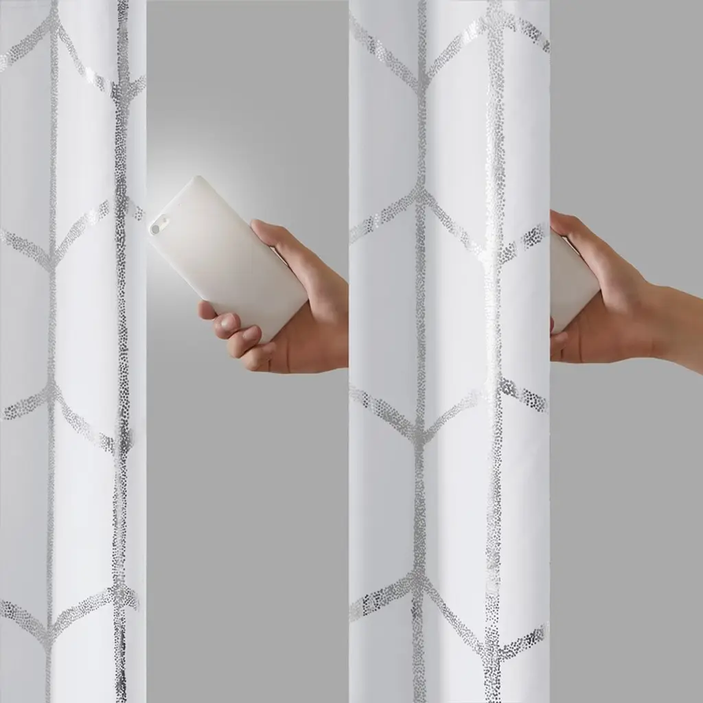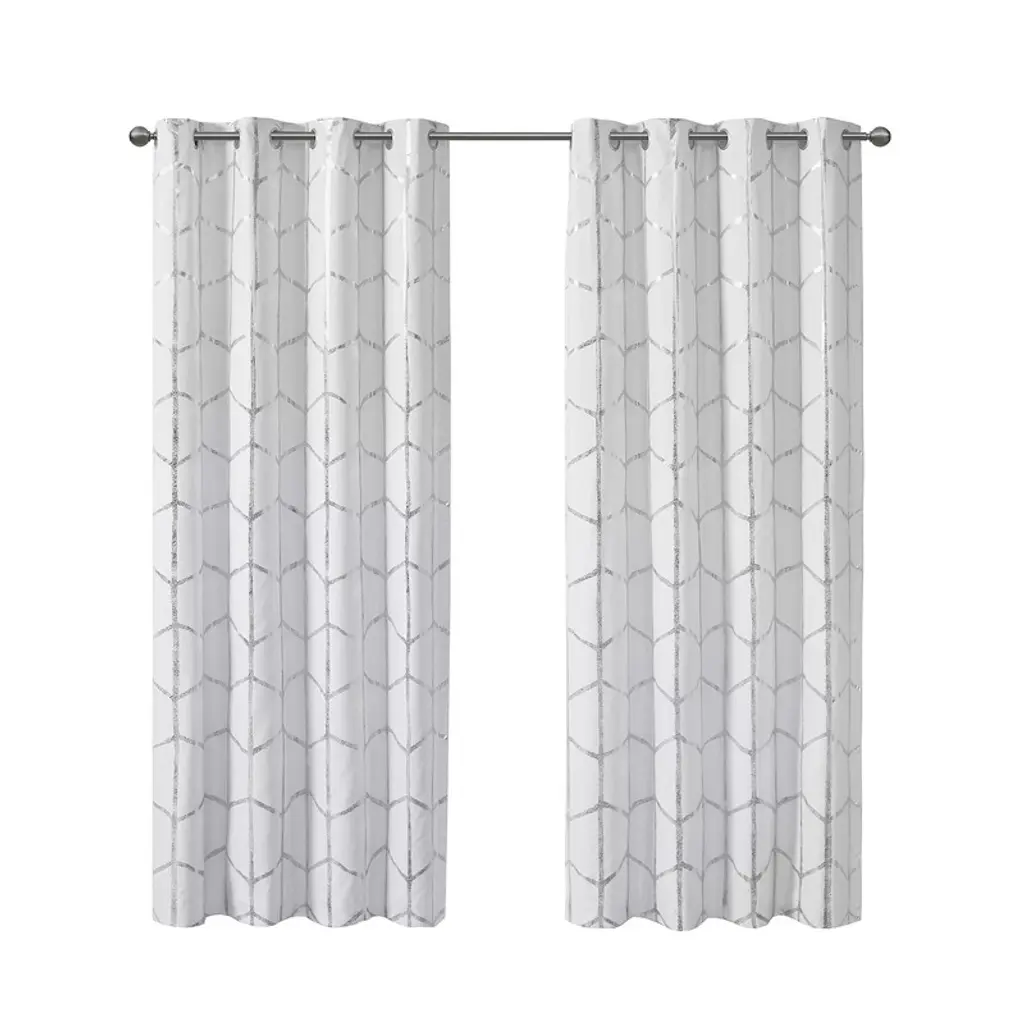 Description Freshen up your space with the enchanting style of Intelligent Design Raina Window Panel. The stunning panel flaunts a geometric, metallic silver print against a crisp white ground for a fun and eye-catching look! Finished with a heavy 3 pass foamback liner, this thermal panel is 100% total blackout providing energy efficiency and added privacy. Grommet top makes this panel easy to hang, open, and close through the day. Machine washable for easy care; complete the collection with coordinating bedding and shower curtain sold separately. Product Details 50x84" 1 Panel:50"W x 84"L Material 100% polyester