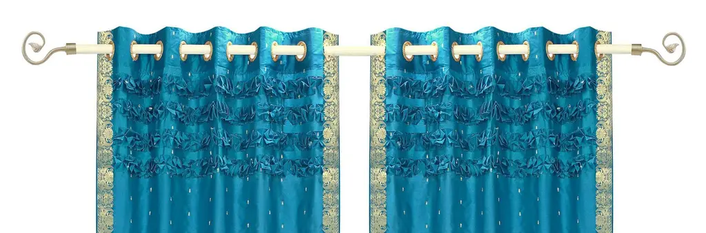 Turquoise Hand Crafted Grommet Top Sheer Sari Curtain Panel -Piece