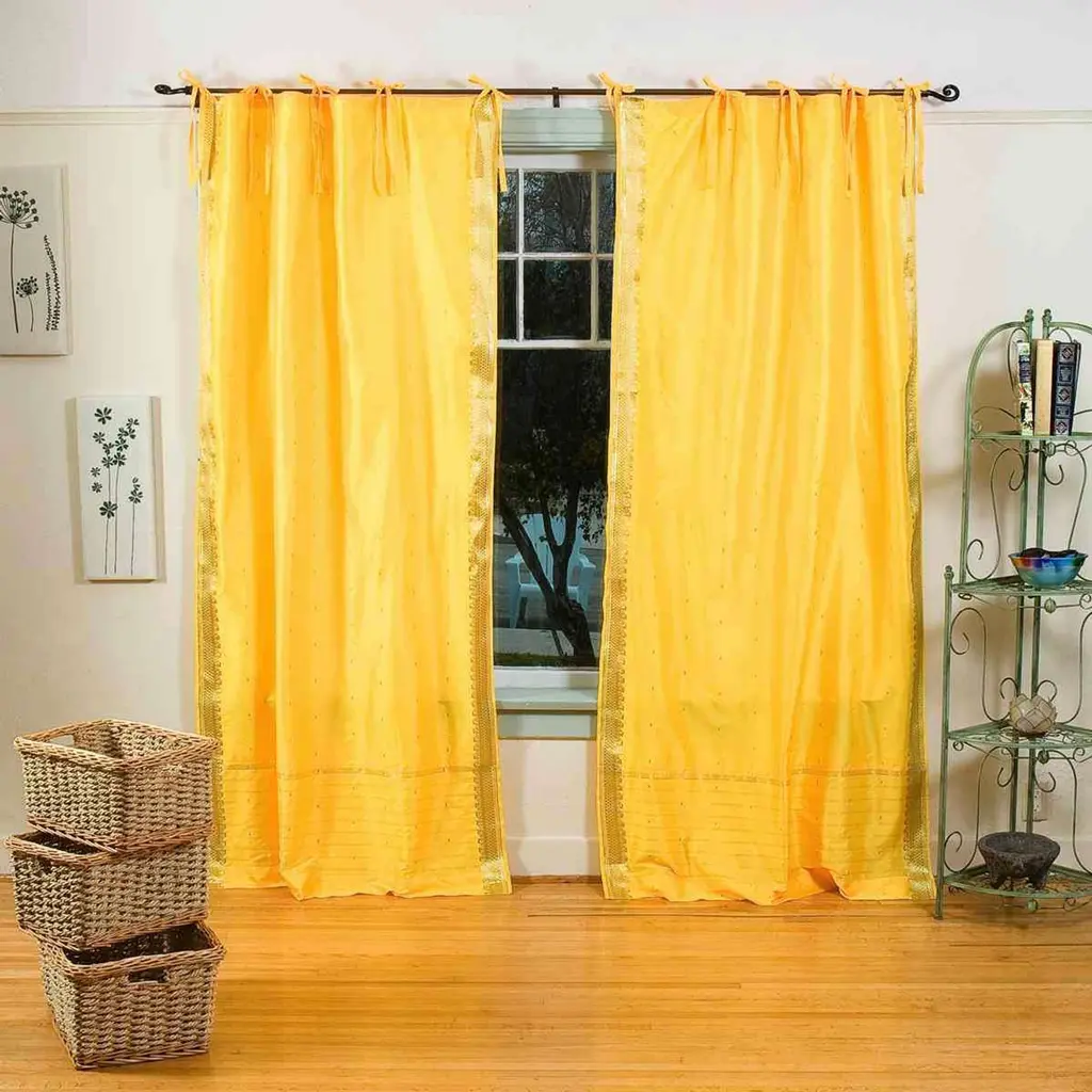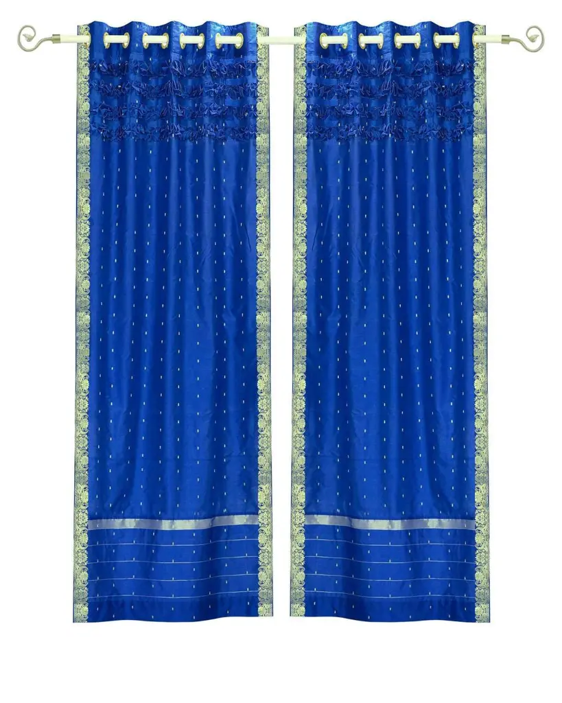 Grommet-top also known as ring top or eyelet top drapery provide a sophisticated and contemporary finish to the windows. Ring-tops have decorative rings attached to the drapes. Rings create a pleated look that is crisp and modern. Intricate ring trim at the top allows it to hang beautifully and adds further elegance. These curtains have a hand made frill design on the top. Sari Curtains / Drapes / Panels are the perfect choice for those looking for light, elegant drapes with a touch of luxury. It has smooth finish with a soft sheen and feels gentle and cool to the touch. Sheer curtains made of saris allow light in through windows but prevent people looking in when they are drawn. Story Behind the Art: The fabric of these curtains are weaved on a hand-loom in a small rural village in India and then hand-dyed. The artisans are a group of young hand-crafters who have moved from small villages to a big town in Central India and make various home decor items out of these exotic sari fabrics. This gives these wonderful artisans a way to have sustainable income via selling to the worldwide market on the internet. Your purchase supports local and home-based work where the artisans can easily tend to their families and pass these time-honored skills from one generation to the next.