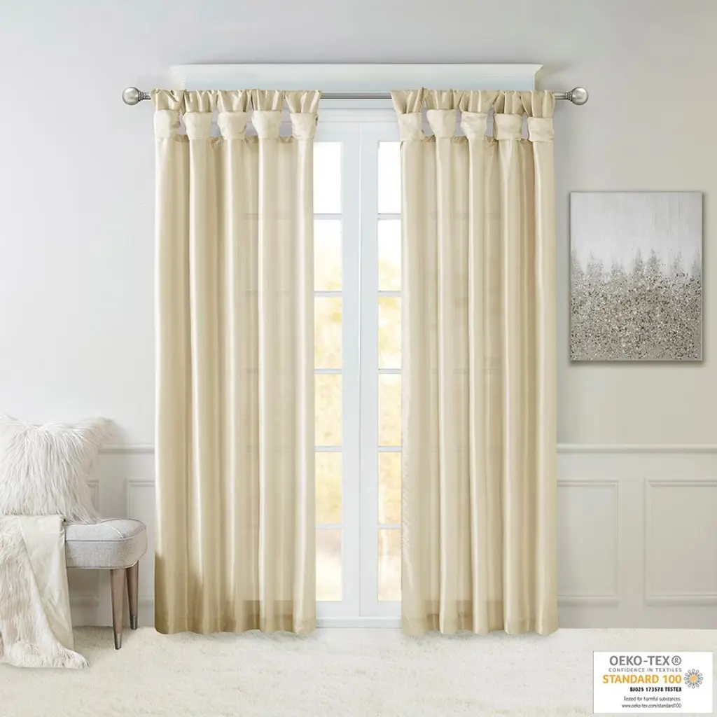 Description Give your home a decorator¡¯s touch with the Madison Park Emilia Window Curtain. Made from a faux silk fabric, this elegant window curtain features a DIY twist tab top finish that creates rich, deep folds for a professional look. Added lining offers more privacy and a fuller appearance, while the luxurious sheen and rich ivory tone provides a touch of sophistication to your d¨¦cor. Easy to hang, this tab top curtain turns any room into a gorgeous getaway. Hanging instructions are included. Fits up to a 2in diameter rod. Product Details 50x108in 1 Window Curtain:50x108in Material 100% polyester, poly lining, twisted tab