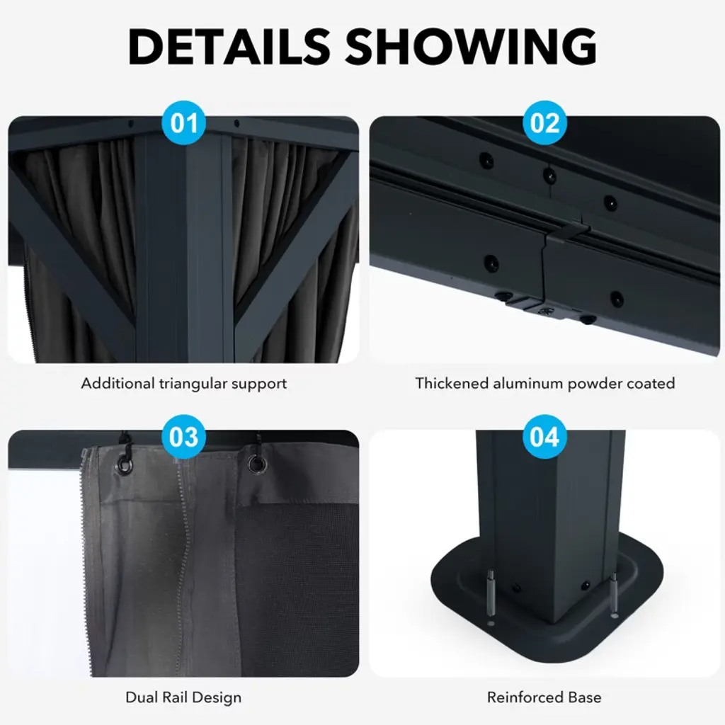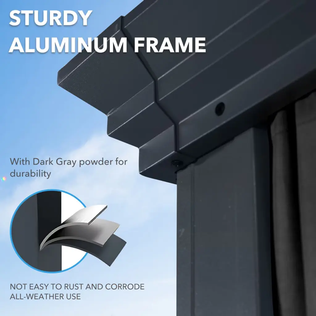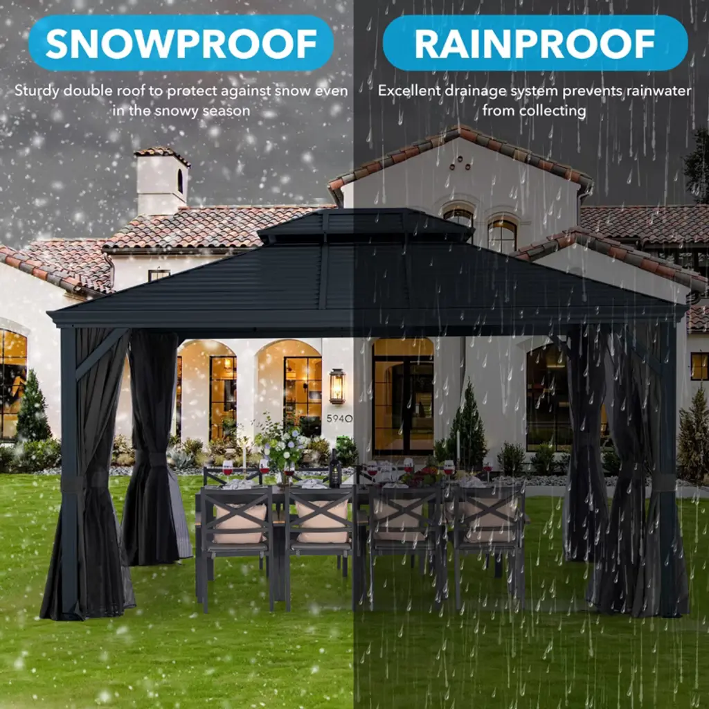 Transform your outdoor space with this Gray Aluminum Hardtop Gazebo featuring a ventilated double roof, durable rust-resistant frame, and efficient rainwater drainage. Enjoy privacy and comfort with removable curtains, a zippered mosquito net, and a built-in hook for lights or fans. Perfect for patios, lawns, gatherings, barbecues, relaxation and versatile outdoor use.