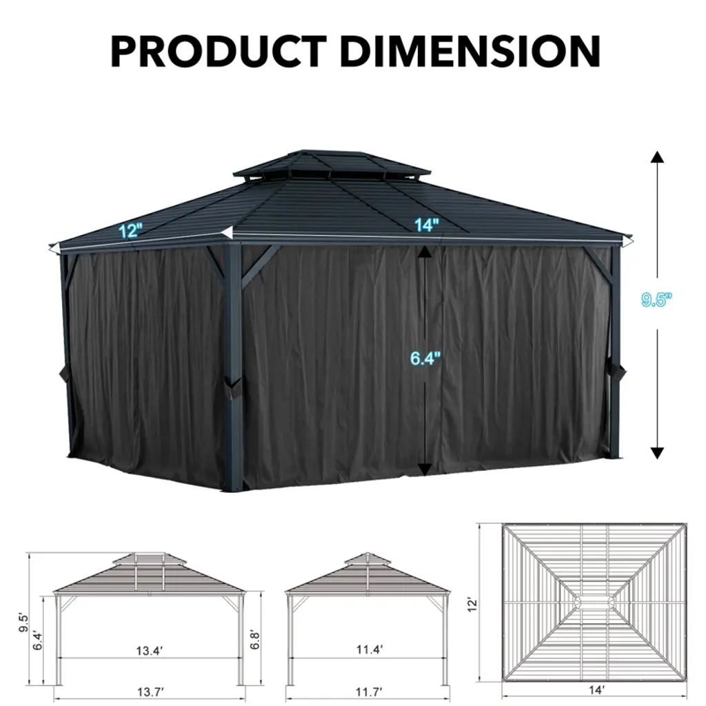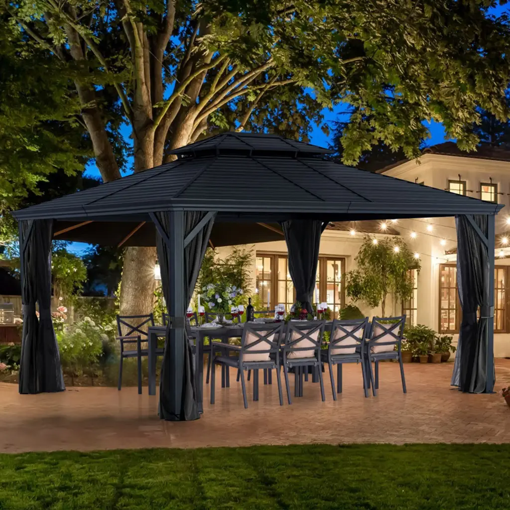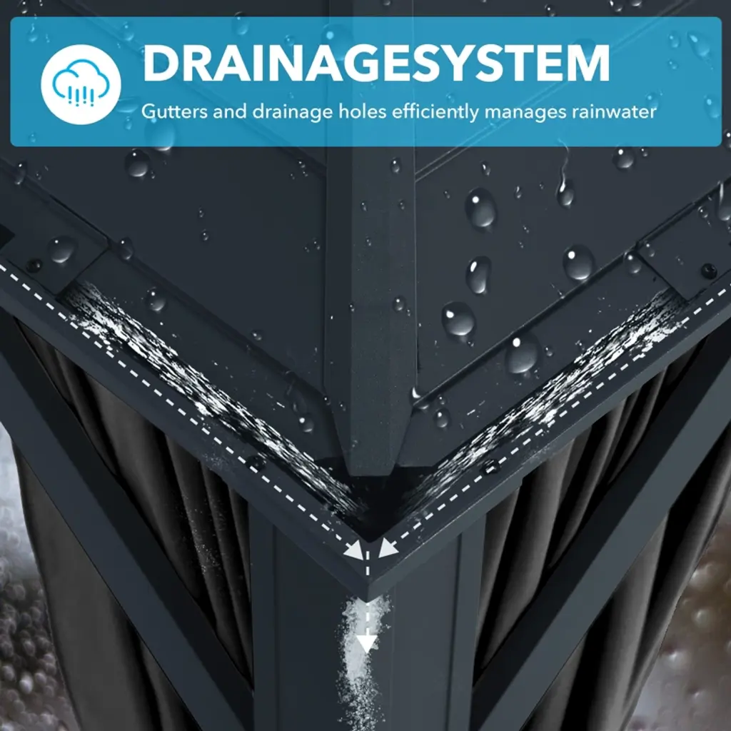 Transform your outdoor space with this Gray Aluminum Hardtop Gazebo featuring a ventilated double roof, durable rust-resistant frame, and efficient rainwater drainage. Enjoy privacy and comfort with removable curtains, a zippered mosquito net, and a built-in hook for lights or fans. Perfect for patios, lawns, gatherings, barbecues, relaxation and versatile outdoor use.