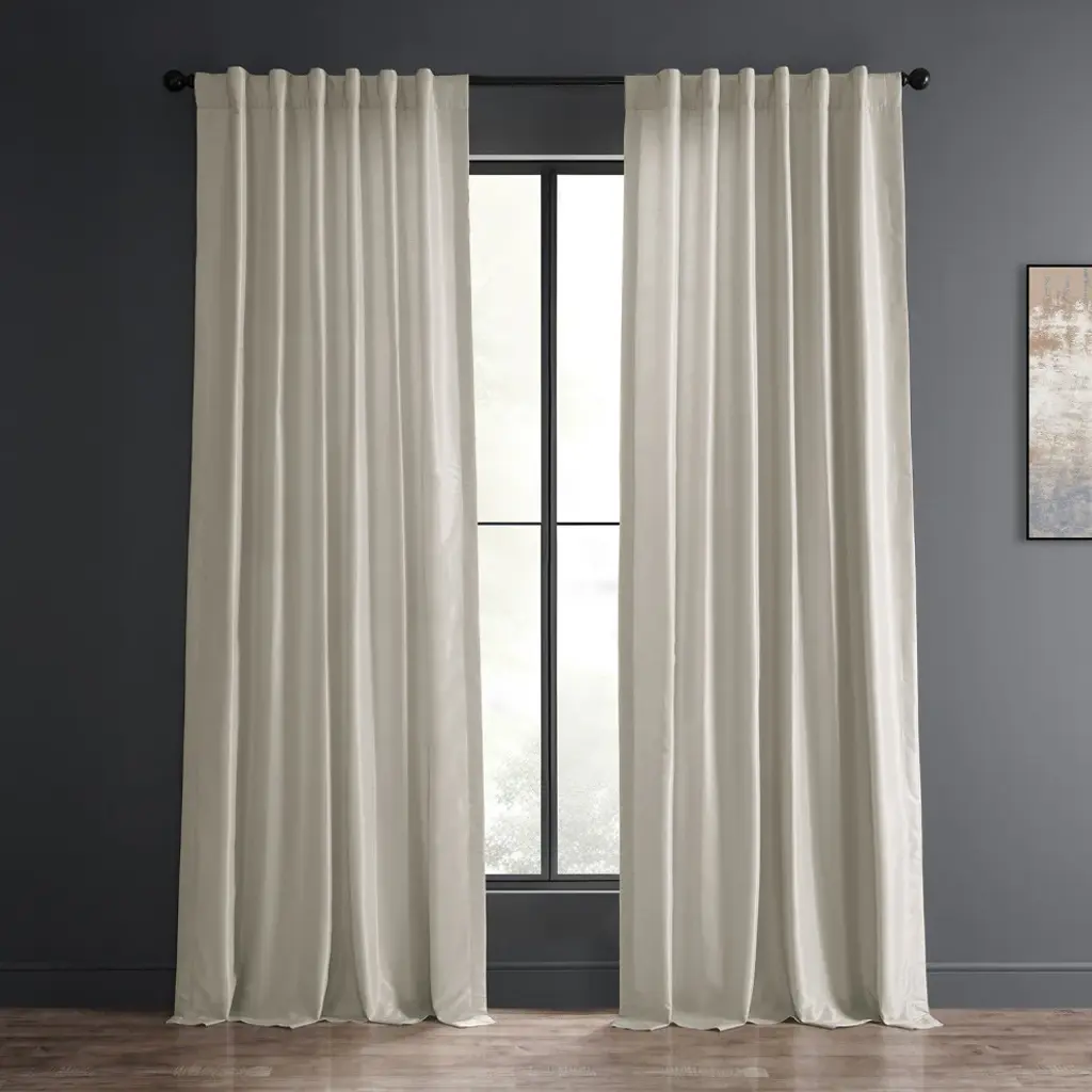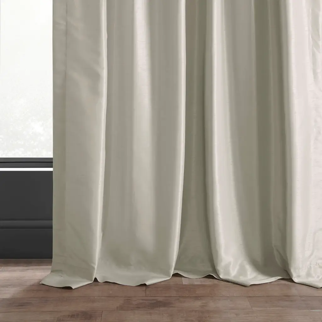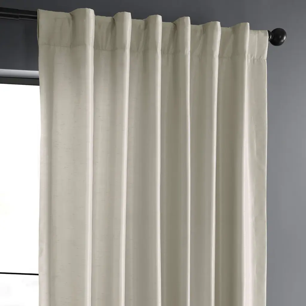 Our Vintage Textured Faux Silk curtains & drapes have a slight sheen that mimics the finest texture of silk dupioni. These curtains bring the look of luxury without the cost or high-maintenance care. Built-in are two header designs within a single panel. The attached back tabs for a formal pleated look and a traditional pole pocket. As a general rule, for proper fullness panels should measure 2-3 times the width of your window/opening.Sold Per Panel100% Polyester & Lined3 inch Pole Pocket with Back Tabs & Hook BeltWeighted HemDry Clean Only