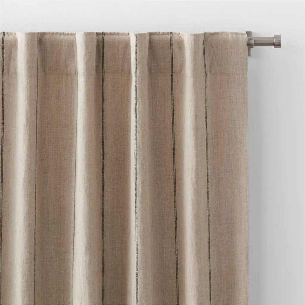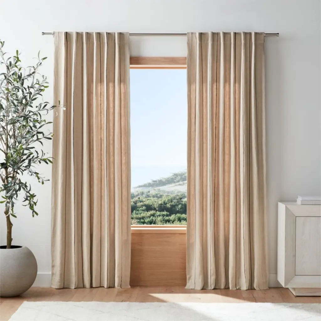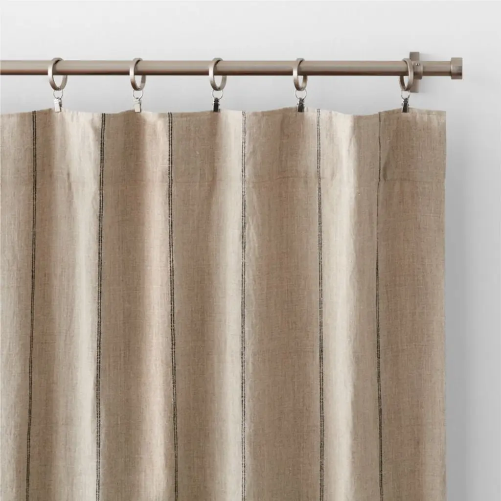 Our curtain panels frame windows with the breezy look of natural linen. Showcasing the organic beauty of woven linen, the warm beige curtain has a hint of decor-friendly pattern in delicate double-lined vertical pinstripes in cool grey. Hang our cotton-lined linen curtains from the back tabs for an elegant pleated style, use the rod pocket to create a more laid-back gathered look or add a set of our curtain clips (sold separately)Try it on first. Since color representation may vary by screen, using a swatch is an easy way to see exactly how your favorite curtain panels will look in your home. Choose up to five free curtain swatches, and we'll ship them to you at no cost.Curtain hardwarealso available.Learn how to hang curtains in our guide.