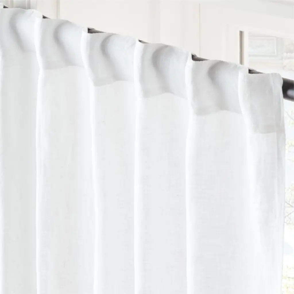 Light-filtering linen drapery is woven from natural flax grown in Europe. Full-length in gauzy white. Hangs beautifully with back tabs, rod pocket or drapery hooks. CB2 exclusive.