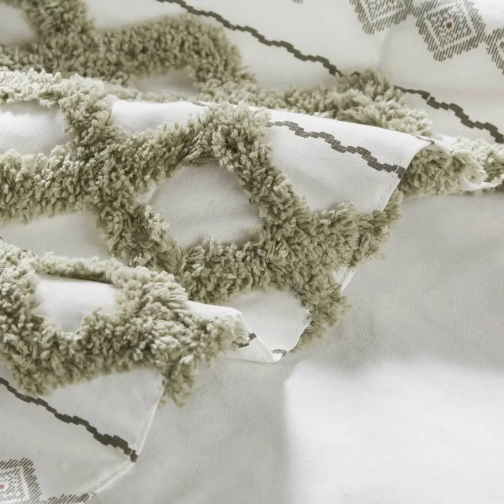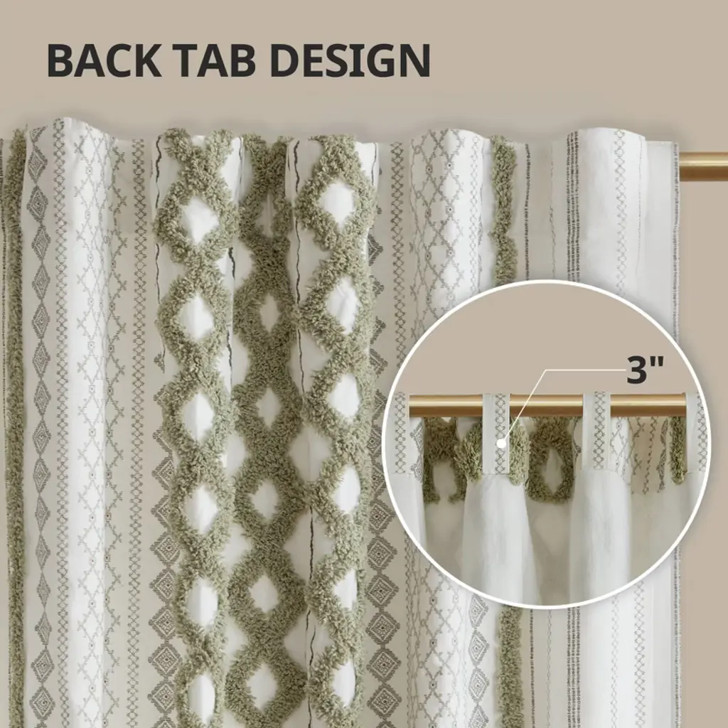 100% cotton, printed and tufted with chenille, with cotton lining on the back. Finished with rod pockets and back tabs; fits up to 1.25 inches diameter rod.