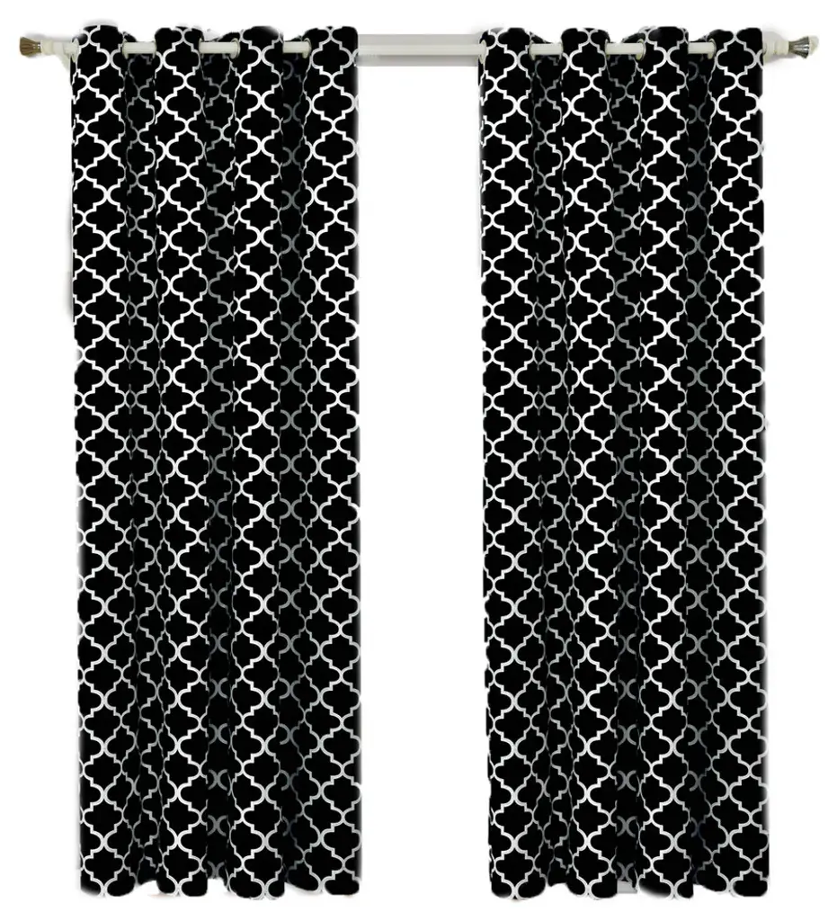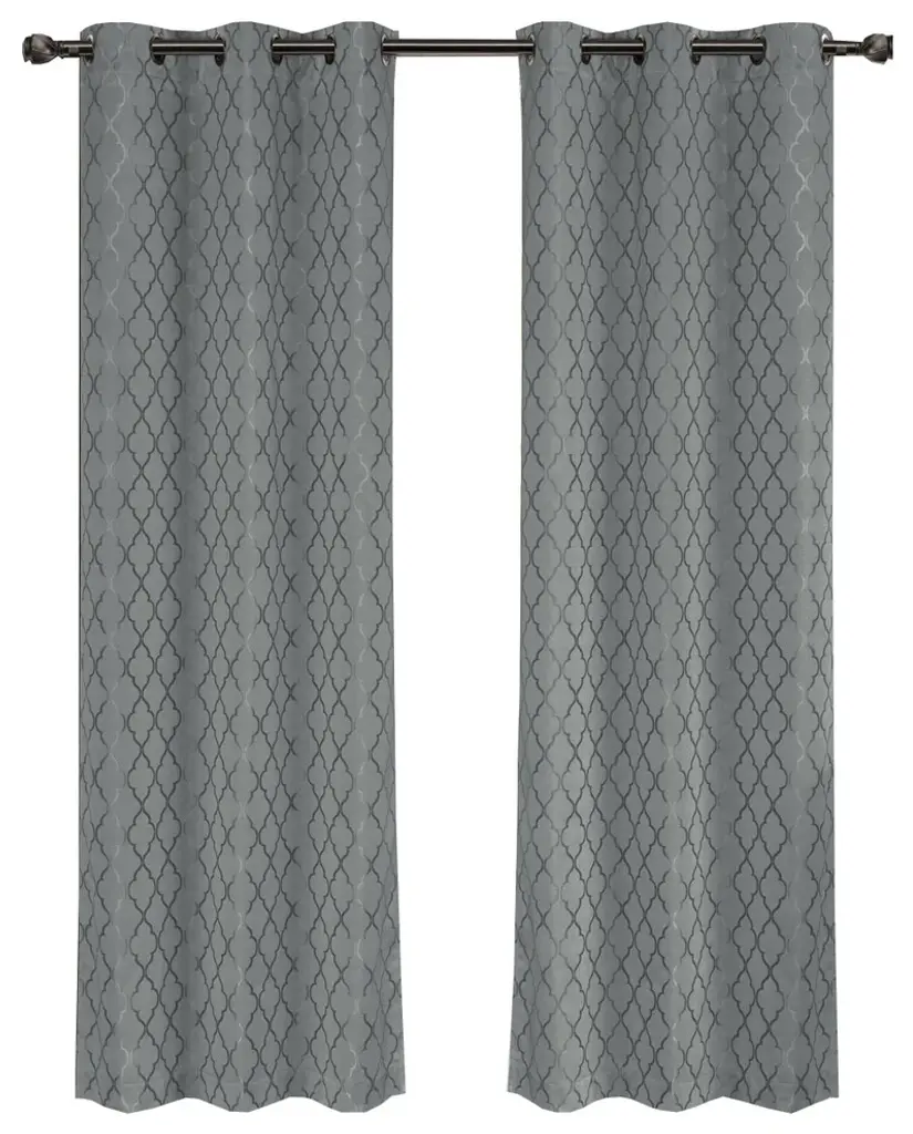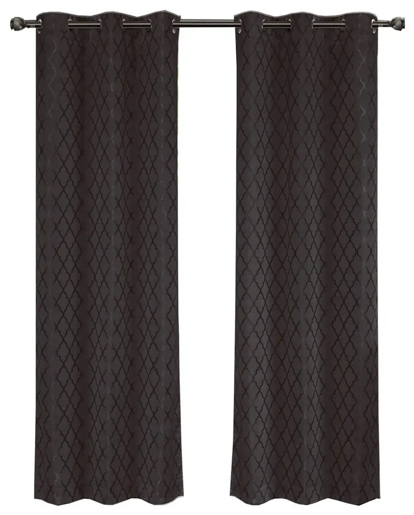 The stylish geometric pattern of these floor-length curtains conveys a refined and classic look to your home. Containing a pole pocket design, these jacquard curtains are well-suited with traditional curtain rods, allowing you to change your room easily. This trendy and functional curtain panel pair is thermal-insulated, blocks out the glaring sunlight during the hot summer months, and keeps cold drafts adrift. Block unwanted light and protect your room against outside temperatures with these thermal blackout curtains. These energy saving curtains are both beautiful and practical. The curtains are machine washable for easy care. - Sold in pairs- 100% polyester- Royal Tradition Brand- Thermal-insulated backing- Innovated fabric construction- Blocks over 99% of light than ordinary curtains- Triple-pass thermal coating back layer- Provides noise reduction and privacy- Saves on home heating and cooling costs- Silver Grommets- Machine-washable Available Sizes Include:- 84"W x 63"L Pair. (42"W x 63"L each) - 84"W x 84"L Pair. (42"W x 84"L each) - 84"W x 96"L Pair. (42"W x 96"L each) - 84"W x 108"L Pair. (42"W x 108"L each)