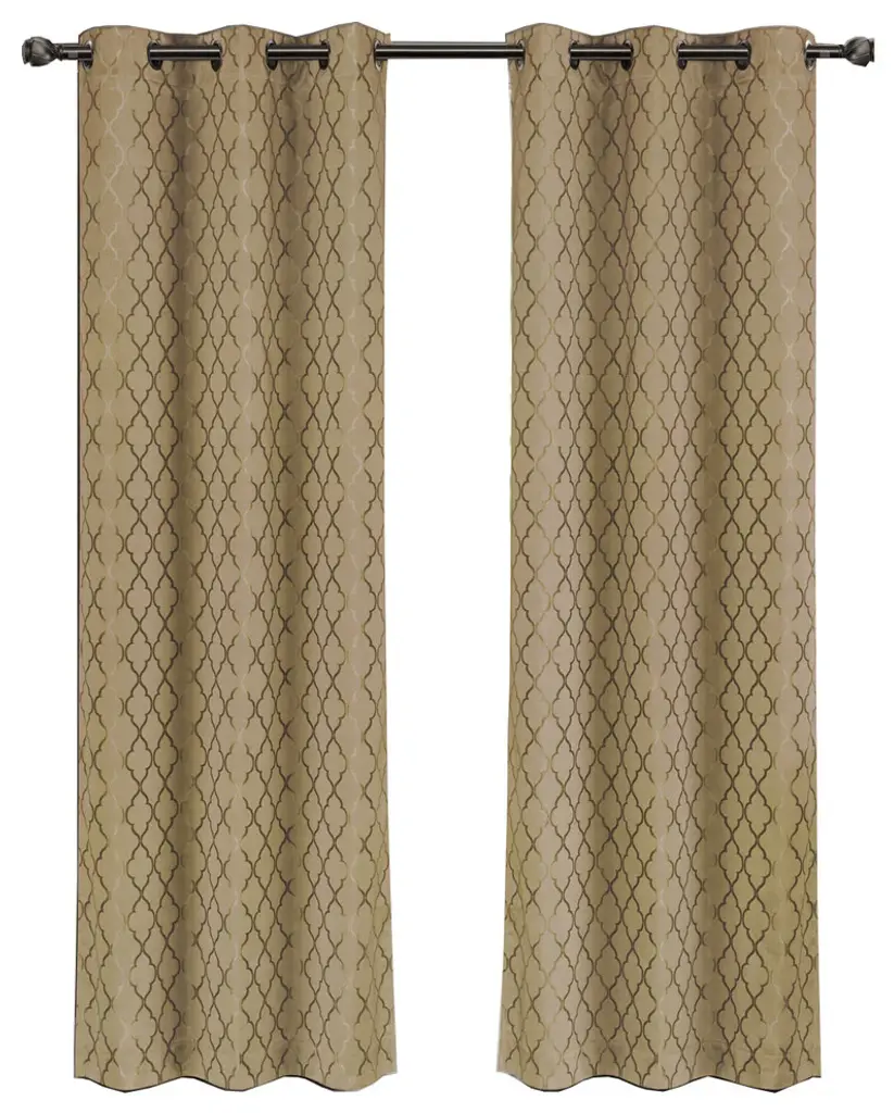 The stylish geometric pattern of these floor-length curtains conveys a refined and classic look to your home. Containing a pole pocket design, these jacquard curtains are well-suited with traditional curtain rods, allowing you to change your room easily. This trendy and functional curtain panel pair is thermal-insulated, blocks out the glaring sunlight during the hot summer months, and keeps cold drafts adrift. Block unwanted light and protect your room against outside temperatures with these thermal blackout curtains. These energy saving curtains are both beautiful and practical. The curtains are machine washable for easy care. - Sold in pairs- 100% polyester- Royal Tradition Brand- Thermal-insulated backing- Innovated fabric construction- Blocks over 99% of light than ordinary curtains- Triple-pass thermal coating back layer- Provides noise reduction and privacy- Saves on home heating and cooling costs- Silver Grommets- Machine-washable Available Sizes Include:- 84"W x 63"L Pair. (42"W x 63"L each) - 84"W x 84"L Pair. (42"W x 84"L each) - 84"W x 96"L Pair. (42"W x 96"L each) - 84"W x 108"L Pair. (42"W x 108"L each)