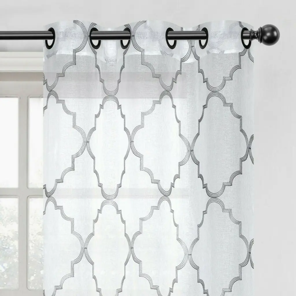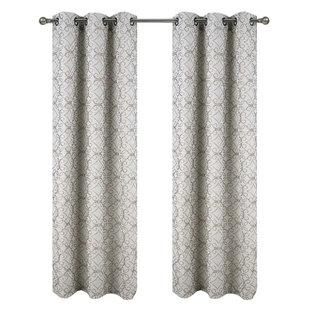 The stylish geometric pattern of these floor-length curtains conveys a refined and classic look to your home. Containing a pole pocket design, these jacquard curtains are well-suited with traditional curtain rods, allowing you to change your room easily. This trendy and functional curtain panel pair is thermal-insulated, blocks out the glaring sunlight during the hot summer months, and keeps cold drafts adrift. Block unwanted light and protect your room against outside temperatures with these thermal blackout curtains. These energy saving curtains are both beautiful and practical. The curtains are machine washable for easy care. - Sold in pairs- 100% polyester- Royal Tradition Brand- Thermal-insulated backing- Innovated fabric construction- Blocks over 99% of light than ordinary curtains- Triple-pass thermal coating back layer- Provides noise reduction and privacy- Saves on home heating and cooling costs- Silver Grommets- Machine-washable Available Sizes Include:- 84"W x 63"L Pair. (42"W x 63"L each) - 84"W x 84"L Pair. (42"W x 84"L each) - 84"W x 96"L Pair. (42"W x 96"L each) - 84"W x 108"L Pair. (42"W x 108"L each)