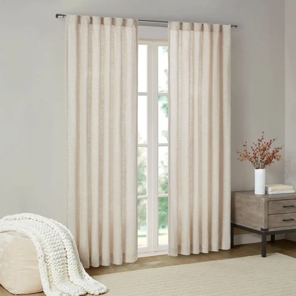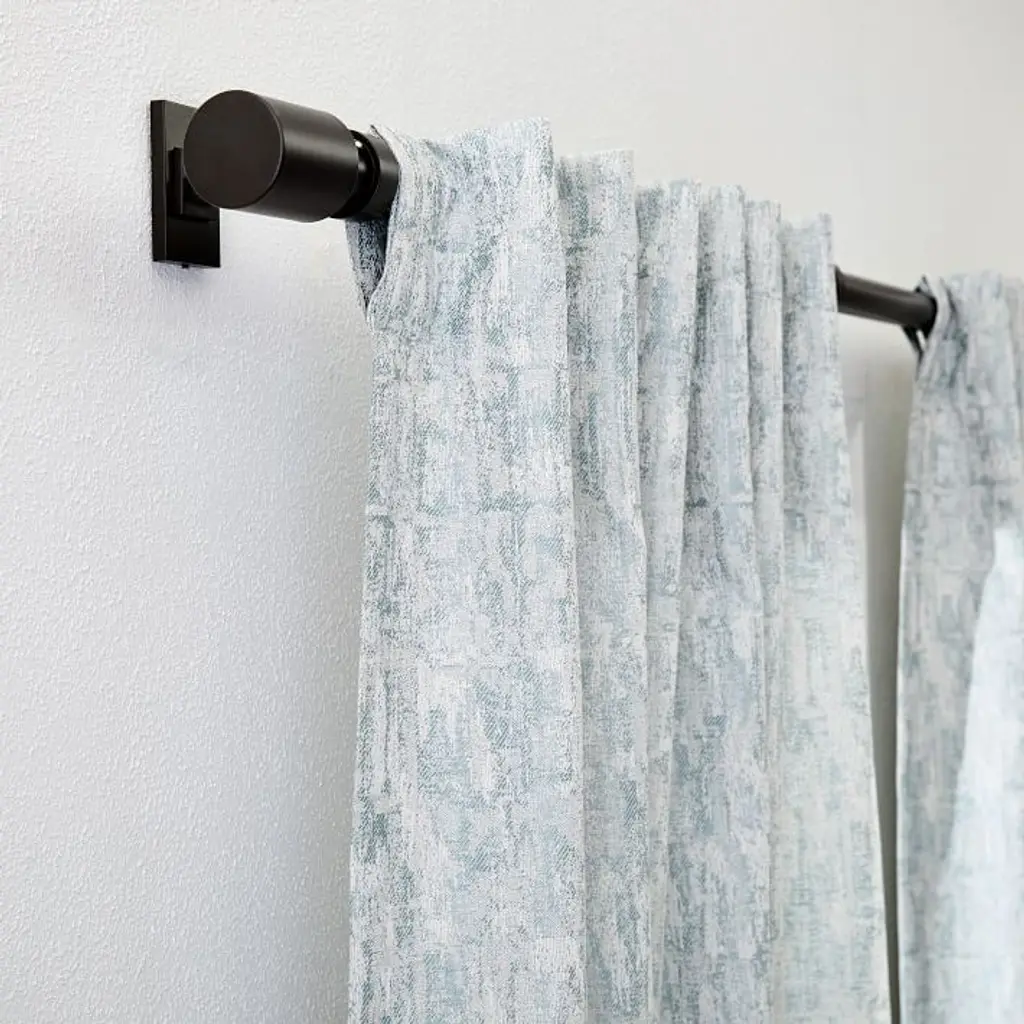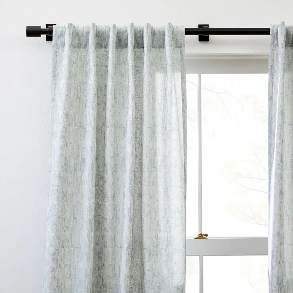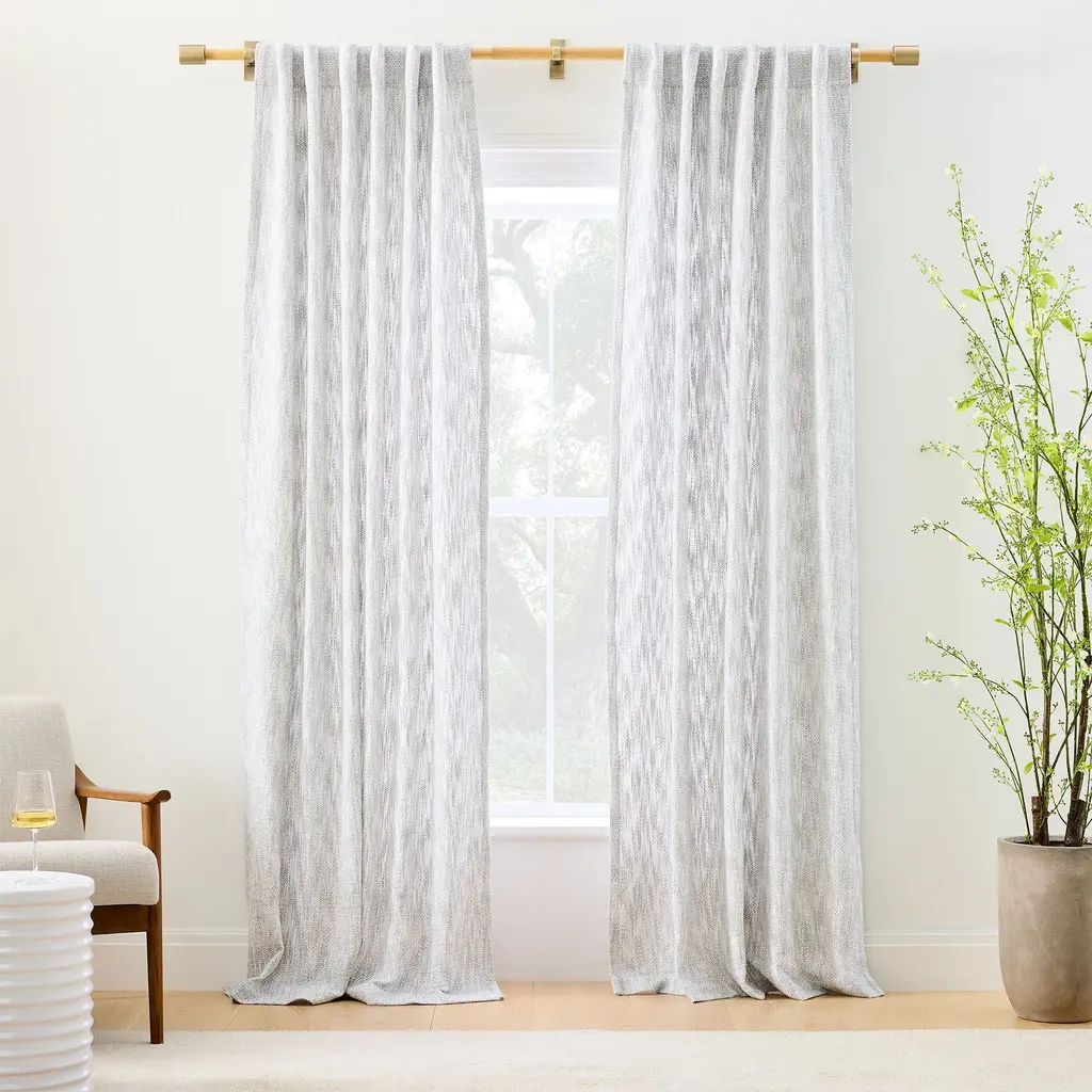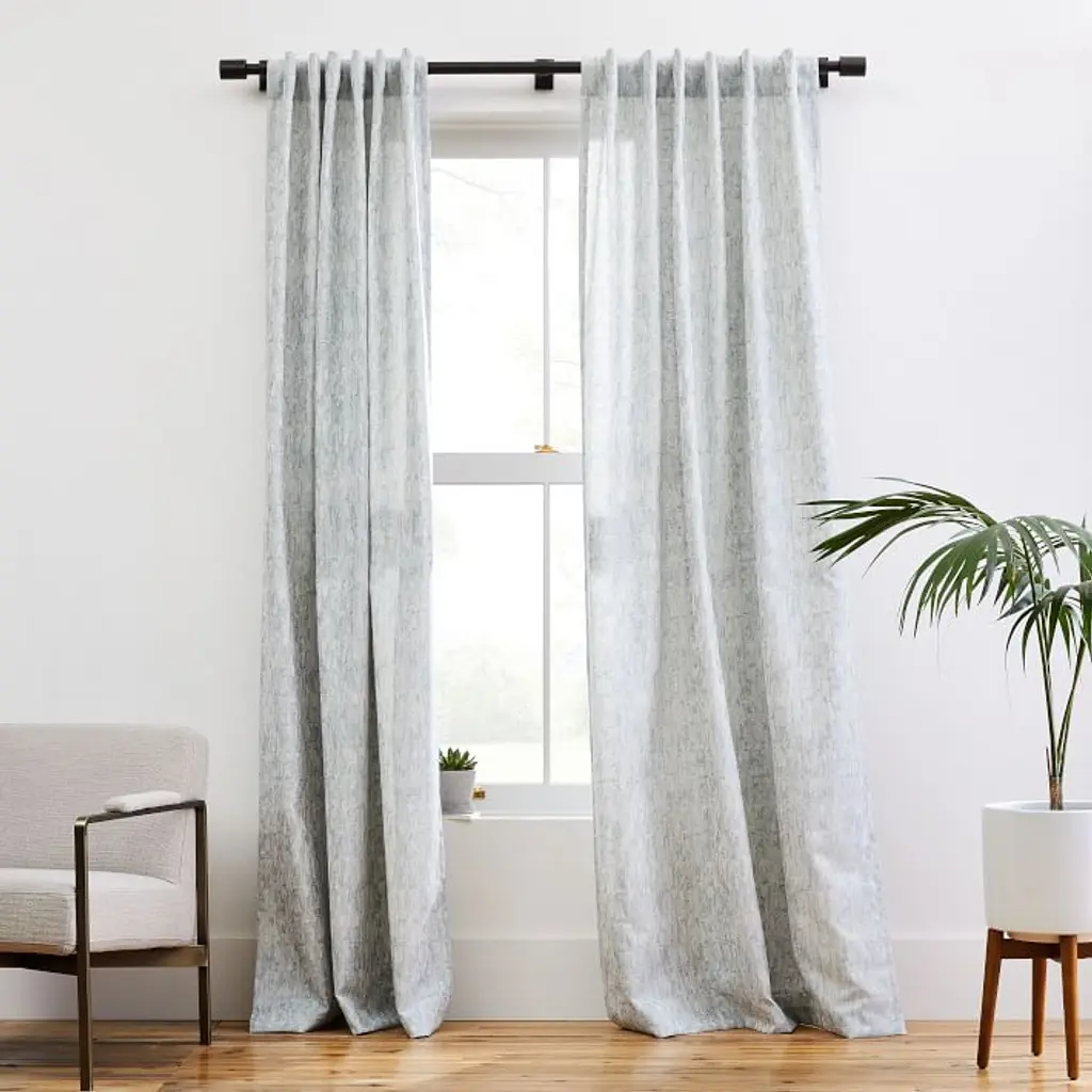 The chic but subtle pattern of our Woodland Shine Jacquard Curtain plays with dark and light, adding depth and dimension to your windows. We wove in lustrous threads for a subtle sheen. Its thick fabric helps to reduce sound and darken rooms. 66% polyester, 34% cotton in Silver Mist. Opaque fabric blocks most light and helps insulate windows. Various lengths, all sizes 48"w. Pole pocket diameter: 4.25". 2-in-1 construction with dual hanging options: rod pocket (bunched) or back tabs (pleated). Coordinates with West Elm’s window hardware (sold separately). Each curtain panel sold individually or as a set of 2. Made in India. To ensure a proper fit, visit our Curtain Guide.