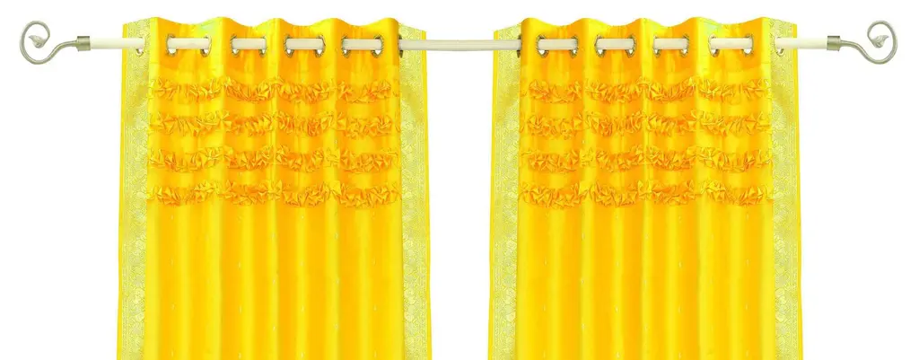 Grommet-top also known as ring top or eyelet top drapery provide a sophisticated and contemporary finish to the windows. Ring-tops have decorative rings attached to the drapes. Rings create a pleated look that is crisp and modern. Intricate ring trim at the top allows it to hang beautifully and adds further elegance. These curtains have a hand made frill design on the top. Sari Curtains / Drapes / Panels are the perfect choice for those looking for light, elegant drapes with a touch of luxury. It has smooth finish with a soft sheen and feels gentle and cool to the touch. Sheer curtains made of saris allow light in through windows but prevent people looking in when they are drawn. Story Behind the Art: The fabric of these curtains are weaved on a hand-loom in a small rural village in India and then hand-dyed. The artisans are a group of young hand-crafters who have moved from small villages to a big town in Central India and make various home decor items out of these exotic sari fabrics. This gives these wonderful artisans a way to have sustainable income via selling to the worldwide market on the internet. Your purchase supports local and home-based work where the artisans can easily tend to their families and pass these time-honored skills from one generation to the next.