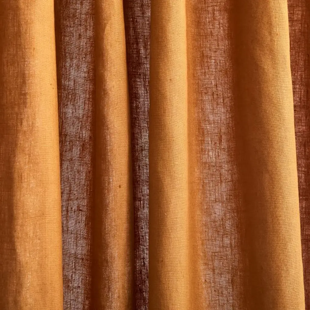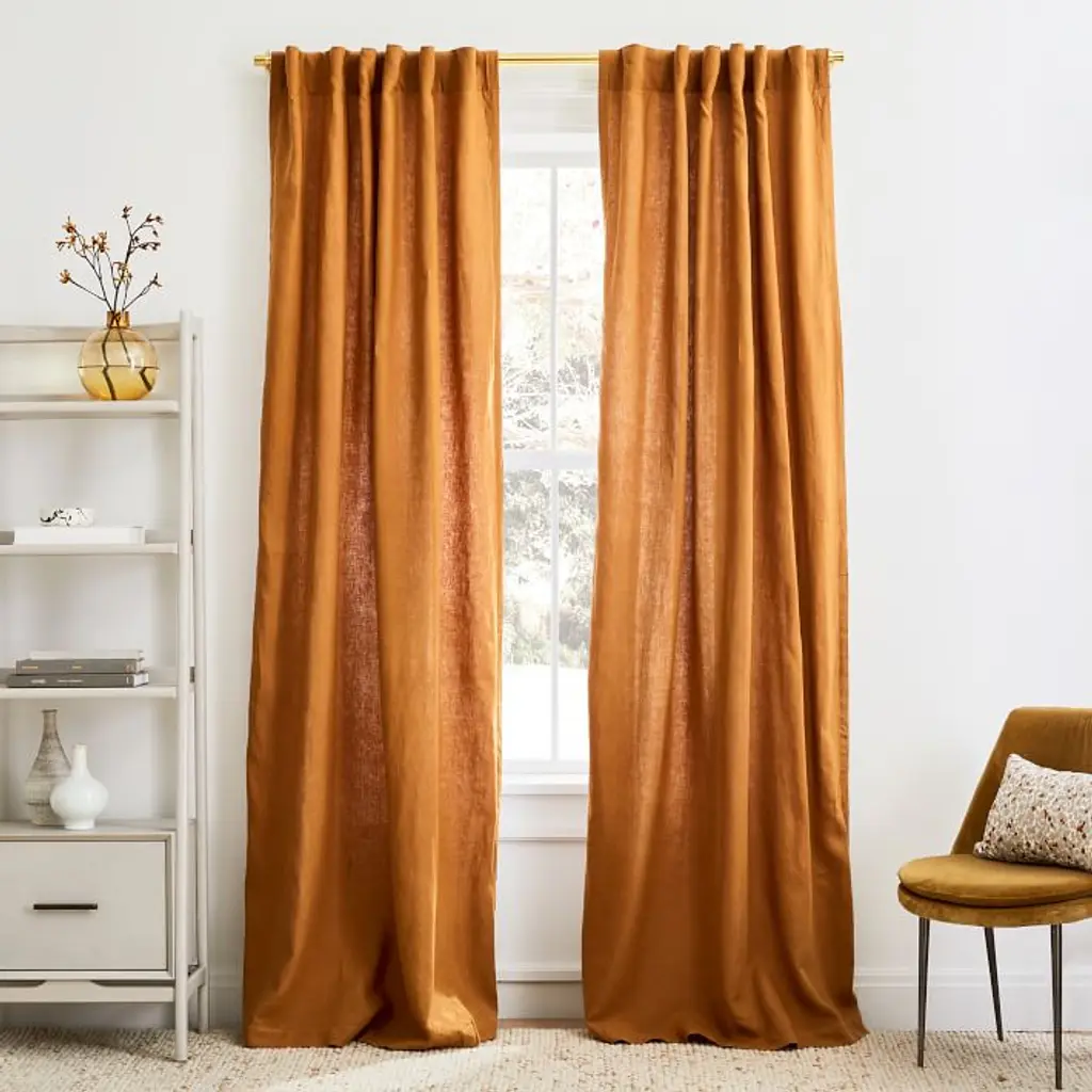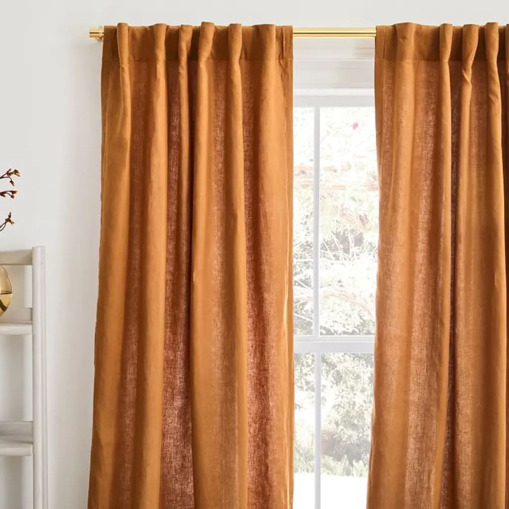 100% European flax in Golden Oak. Opaque fabric blocks most light and helps insulate windows. Various lengths, all sizes 48"w. Pole pocket diameter: 4.25". Dual top treatment: pole pocket (bunched), hidden tab (pleated). Coordinates with West Elm's window hardware (sold separately). Each curtain panel sold separately. Imagery reflects opacity of curtain when exposed to direct sunlight. Made in a Fair Trade Certified™ factory, empowering workers who made it. Linen woven from European-grown flax, constructed in China. To ensure a proper fit, visit our Curtain Guide.