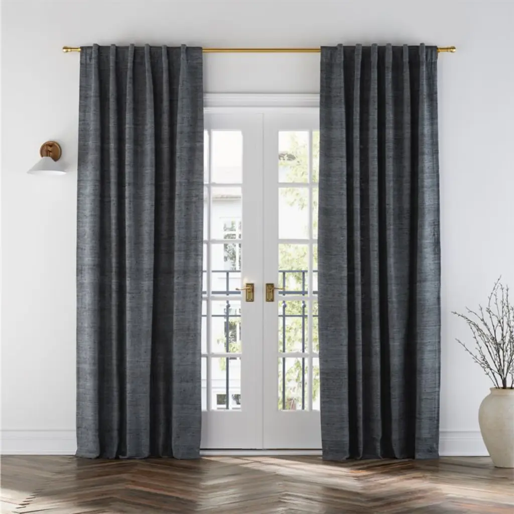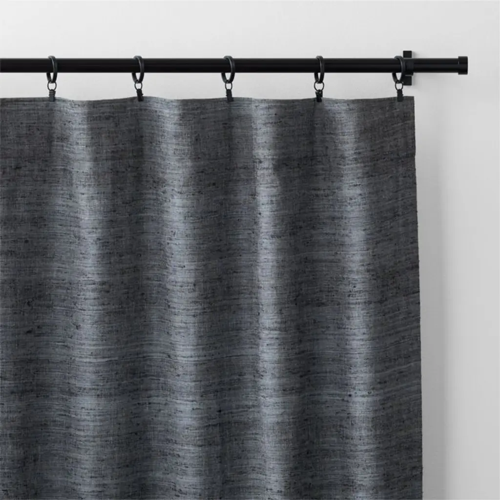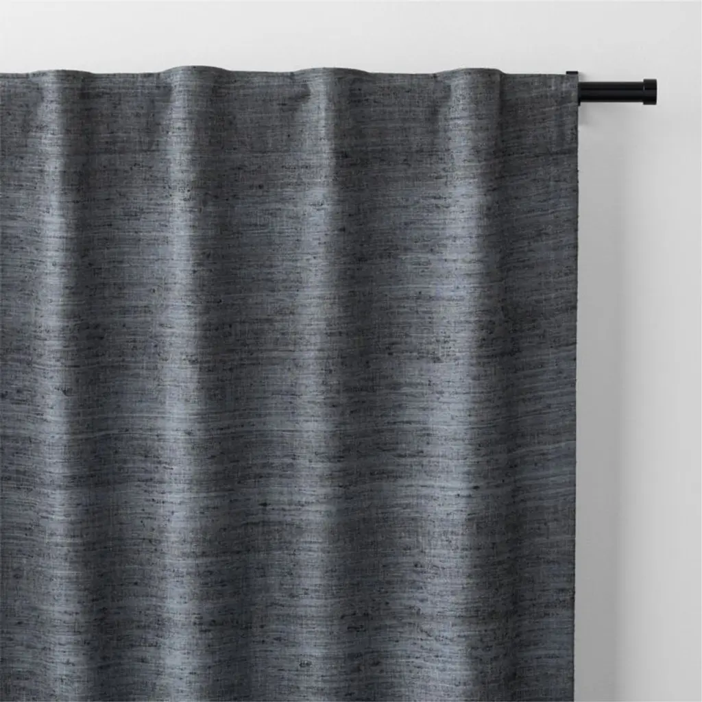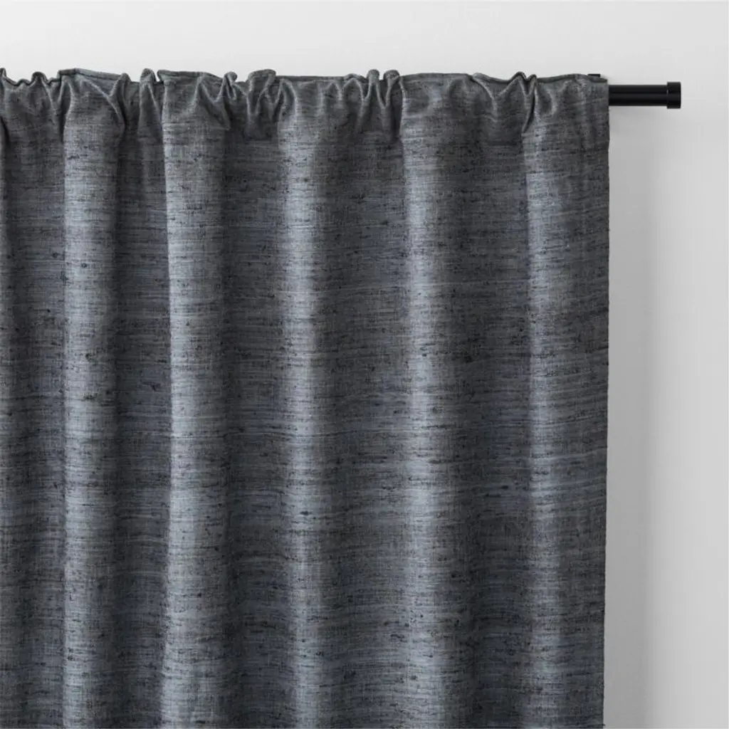 Our Trevino curtain drapes your window in modern organic luxury. Raw silk and cotton takes to dark grey in a dobby weave and tonal shades that add depth and dimension to the fabric's naturally nubby texture. The opaque curtain panel creates a soft, natural atmosphere with a sumptuous touch. Hang the curtain from the back tabs for an elegant pleated style, use the rod pocket to create a more laid-back gathered look or add a set of our curtain clips (sold separately). Pair with our exclusive Sari silk throw pillows for a coordinated living room or bedroom.Curtain hardware also available.Learn how to hang curtains in our guide.