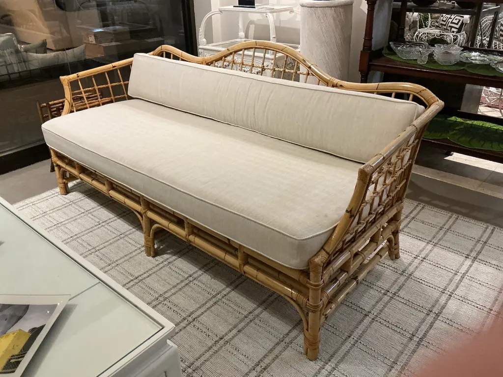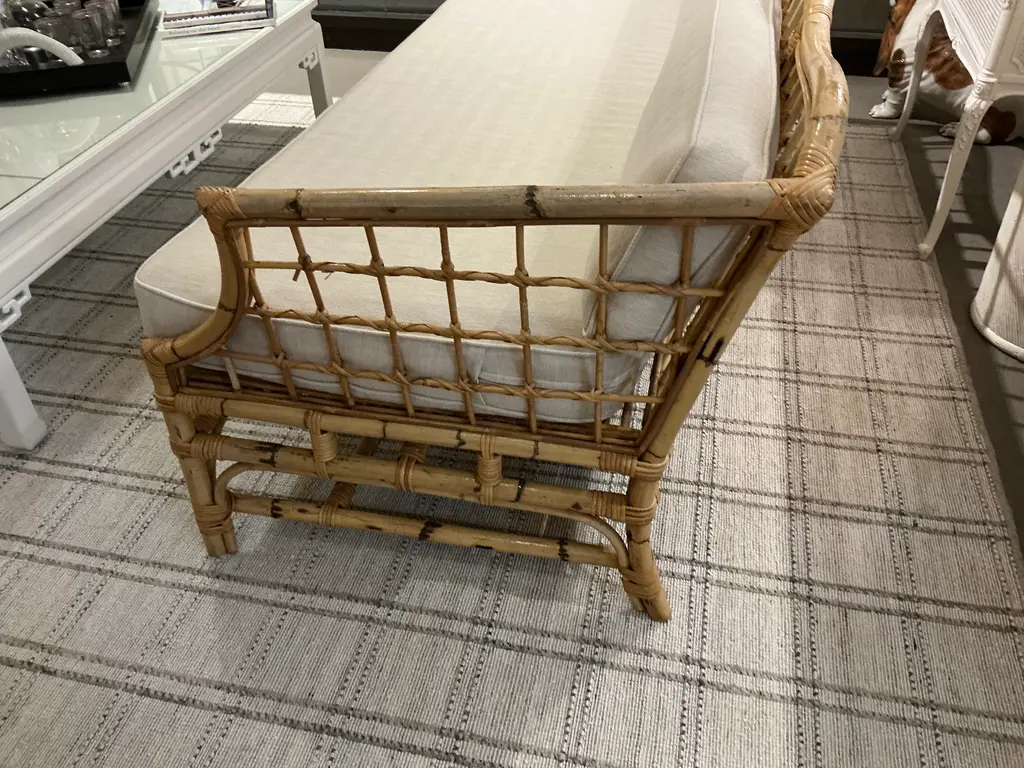 Boho Chic Coastal Burnt Rattan Sofa / Daybed. New Herringbone tone on tone fabric from Pindler.There are two available, special pricing if buying two. Please send a message for inquiries.
