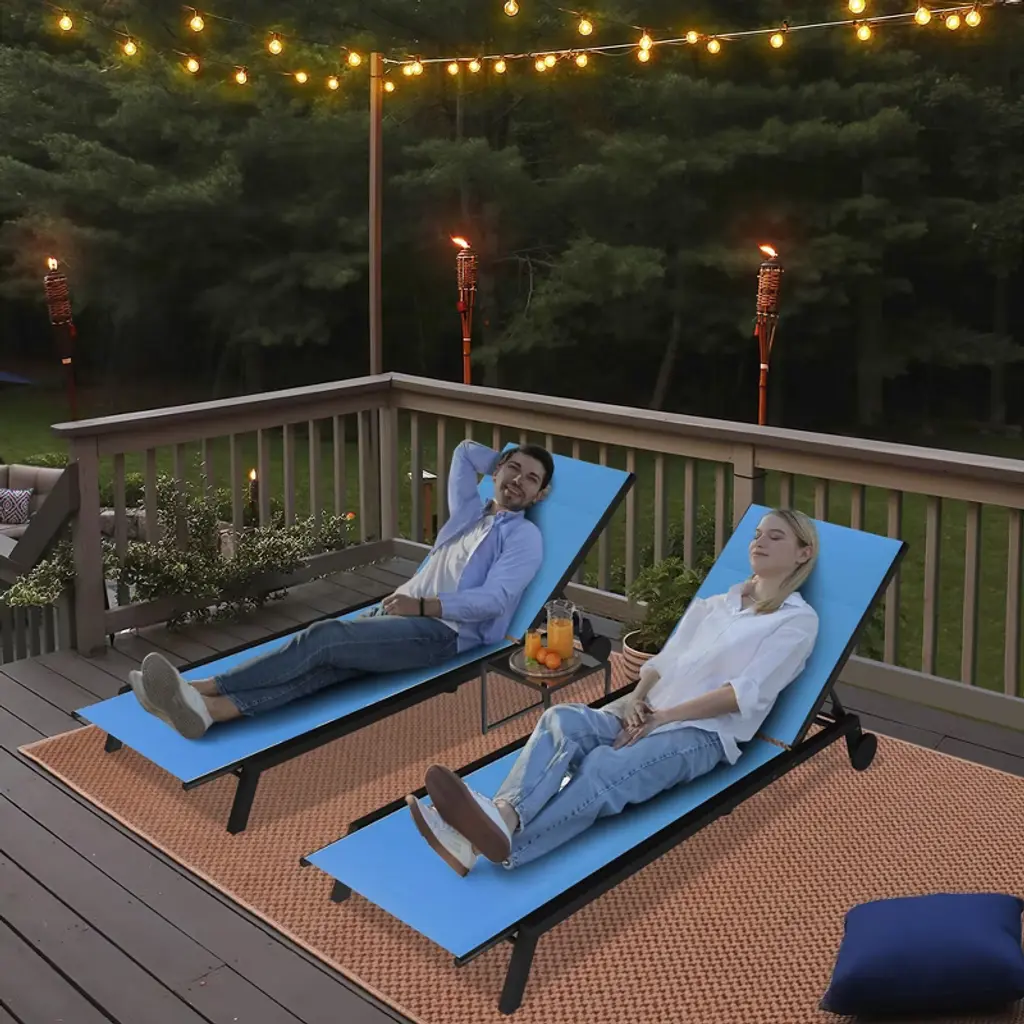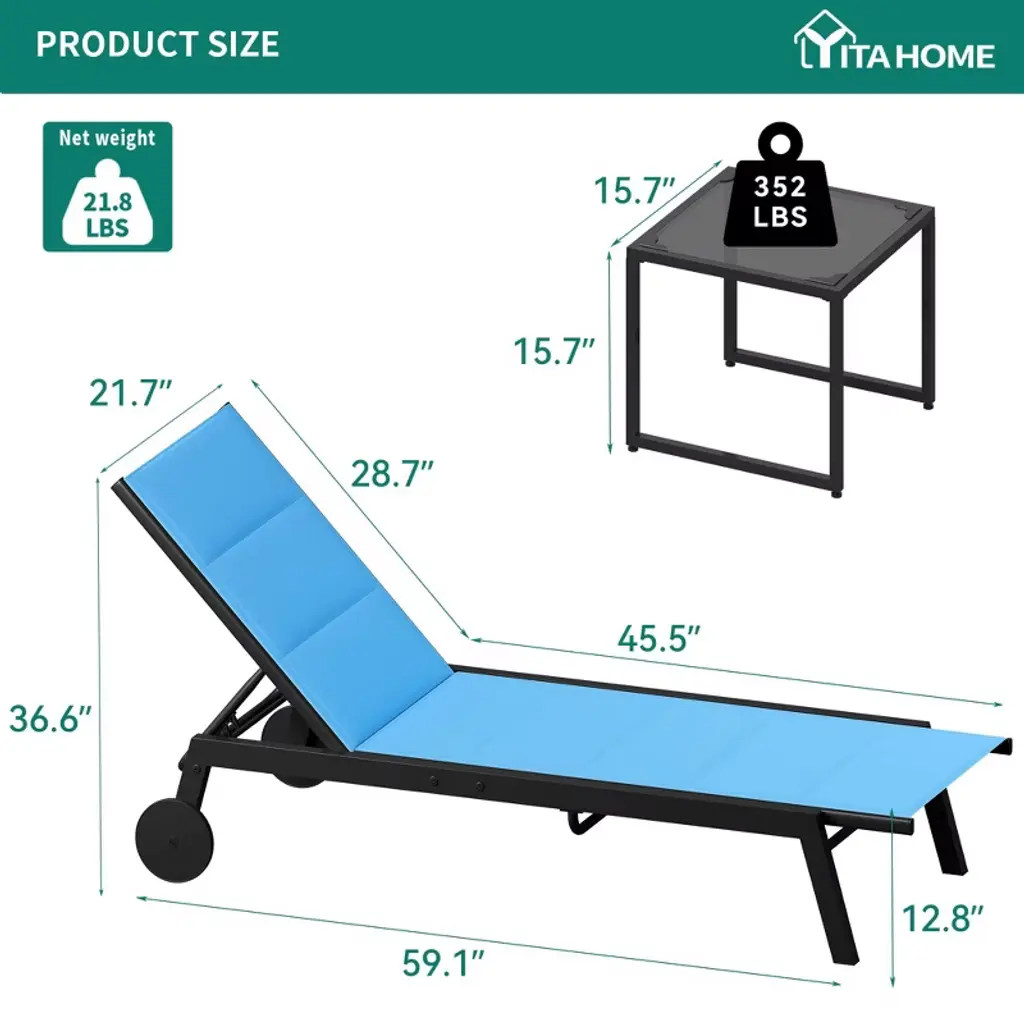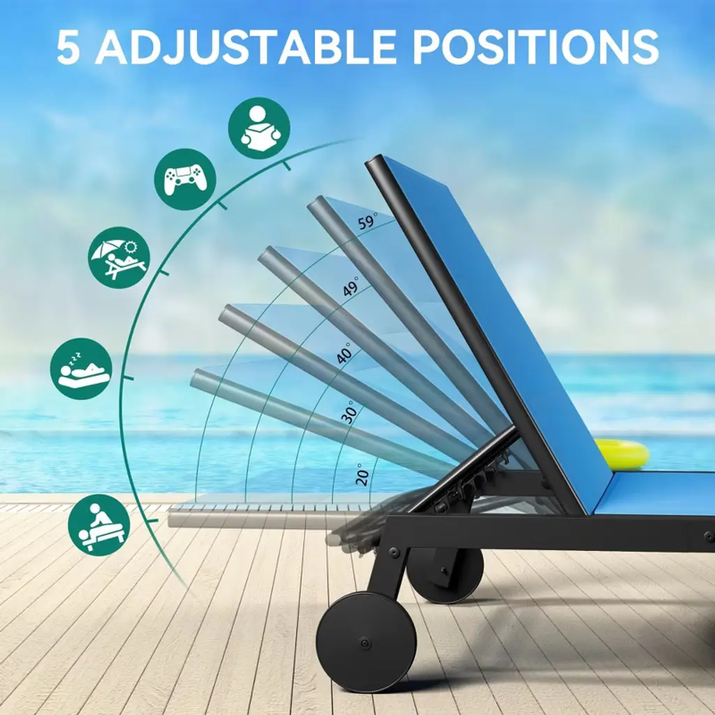 2 Patio Textile Chaise Lounge Chairs with Side Table, Outdoor Chaise Lounge Set, 5-Level Backrest Pool Loungers on Wheel, Sunbathing Chair for Outdoor Pool, Yard, Lawn, Beach, Porch, Garden(Blue)
