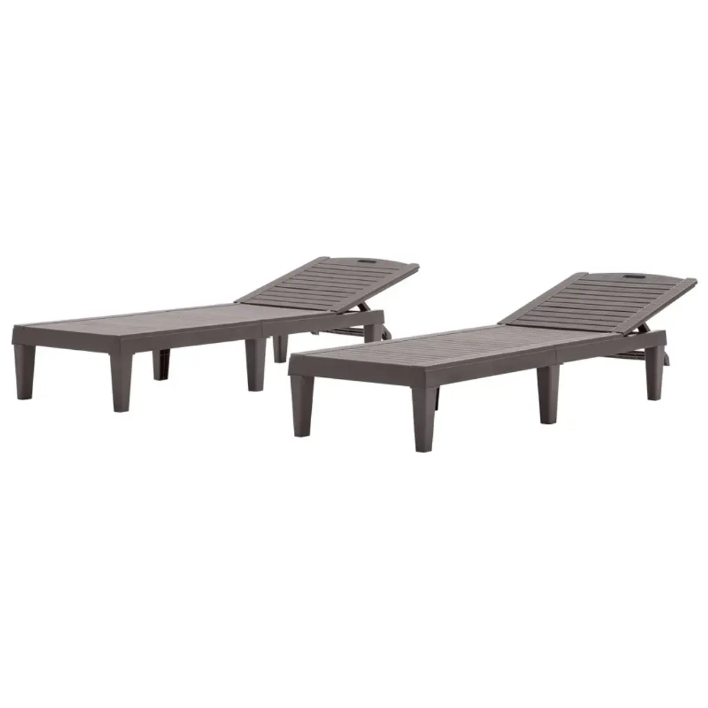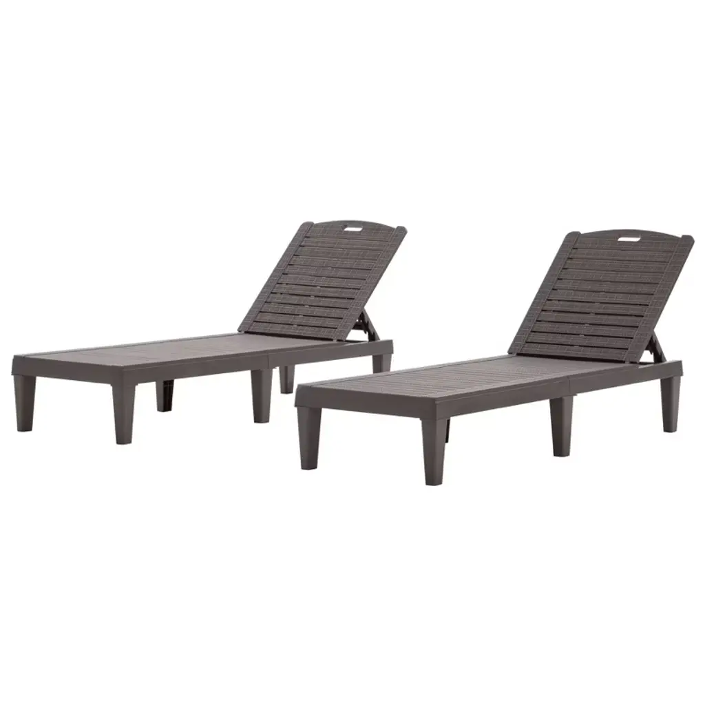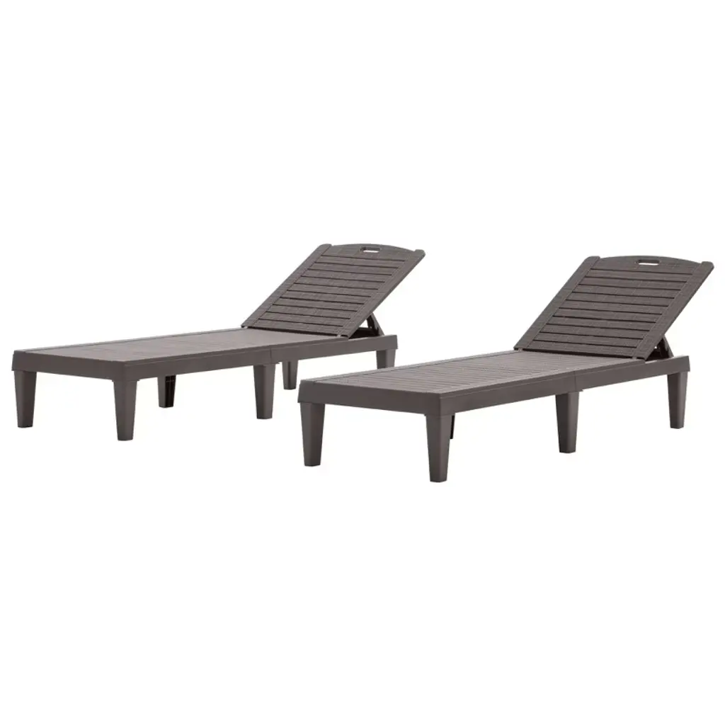 Create your perfect outdoor oasis with this set of two durable and comfortable outdoor chaise lounges. Crafted from 100% weather-resistant polypropylene resin, these loungers are designed to withstand sun and humidity without fading, cracking, or peeling. Each features a 5-level adjustable backrest for customized comfort, a curved, ventilated surface, and a convenient built-in handle for easy portability. With tool-free assembly, you'll be relaxing by the patio, pool, or beach in no time. Specifications Overall Size: 22.4"W x 61.8"-74"D x 11"-28.7"H Adjustable level: 5 Material: Polypropylene Number of Packages: 1. Maintenance & Notice About Finish: Liquids should be immediately blotted with a damp cloth. Do not use surface cleaners that could remove the finish. About Hardware: Hardware may loosen over time; periodically check to make sure all connections are tight. About Fasteners: Don't over-tighten fasteners, as this may cause distortion or breakage. About Color: Real Product's Color may be a little different from the image due to the lighting or monitor's display. About Size: Manual measurement has been used, there may be some reasonable error.