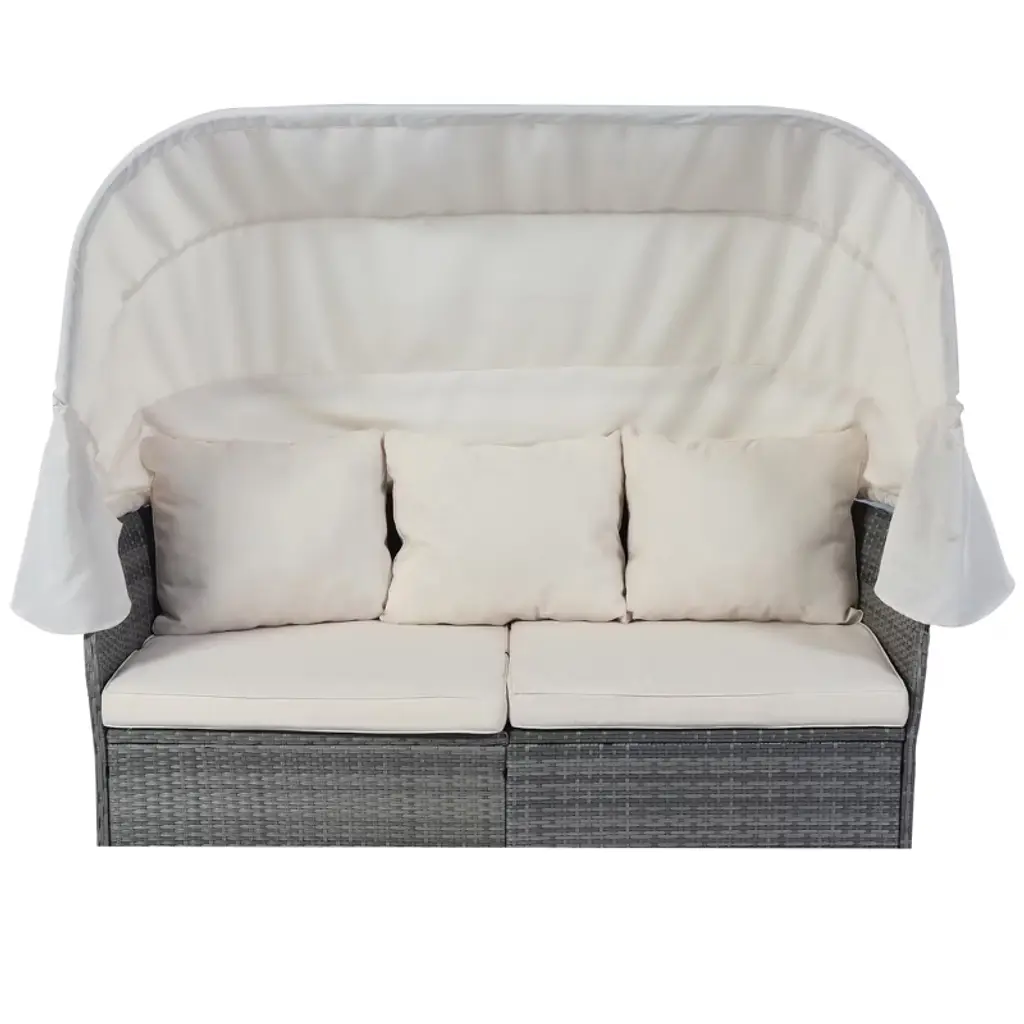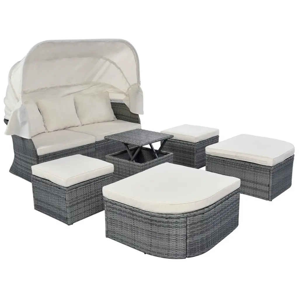 Elevate your outdoor living experience with the Separable PE Rattan Sunbed with Canopy. Designed for both style and functionality, this versatile set is perfect for relaxing by the pool, enjoying a garden party, or lounging in your backyard. With a flexible design, you can easily move the seats, adjust the canopy, and reconfigure the layout to fit your needs. Ideal for those who love to entertain or simply enjoy a quiet afternoon outdoors. Product Features Separable Design for Easy Movement: The modular design allows you to move the seats freely and rearrange them into a rectangle sunbed, a footrest, or even a lift-top coffee table. The thickened cushions and additional throw pillows provide added comfort for extended outdoor relaxation.Quality PE Rattan Wicker: Made with tightly woven, durable PE rattan wicker, this set is designed to withstand the elements, including rain and wind. The waterproof cushion covers are easy to clean, but for long-term use, it’s recommended to provide waterproof protection during extended rainy periods.Flip-Type Canopy: Enjoy the perfect amount of shade with the adjustable flip-type canopy. Easily raise or lower the canopy to block out the sun or to fully enjoy the natural sunlight when you’re reading or lounging. This versatile feature makes it perfect for any weather.Flexible Assembly: This set arrives in three separate packages and requires full assembly. It is recommended that at least two adults complete the assembly for the best results. Dimensions & Specifications Pieces Included: 1 Sofa, 5 OttomansChair Seat/Back Material: Wicker/RattanIndividual Ottoman Weight Capacity: 250 lbsIndividual Curved Ottoman Weight Capacity: 170 lbsSofa Weight Capacity: 700 lbsTable Top Material: Wicker/RattanCushions Included: Yes, includes 7 seat cushions and 3 back cushionsRemovable Cushion Covers: YesCushion Fill Material: High-Density FoamToss Pillows Included: NoAssembly Required: Yes, Full Assembly Needed (at least 2 people) Assembly & Maintenance Tips Installation Tips: Lay cardboard on the ground before installation to avoid staining or scratching the product. Avoid friction between parts during installation to prevent scratches that may be hard to remove. Do not tighten screws completely until all parts are aligned properly.Maintenance: To maintain the beauty of your furniture, it’s recommended to clean the cushions regularly and protect the furniture from prolonged exposure to rain. Transform your outdoor space into a stylish, comfortable haven with the Separable PE Rattan Sunbed with Canopy. Whether you're hosting a barbecue or enjoying some solo time outdoors, this set offers unmatched flexibility, comfort, and durability.