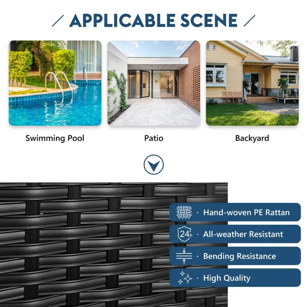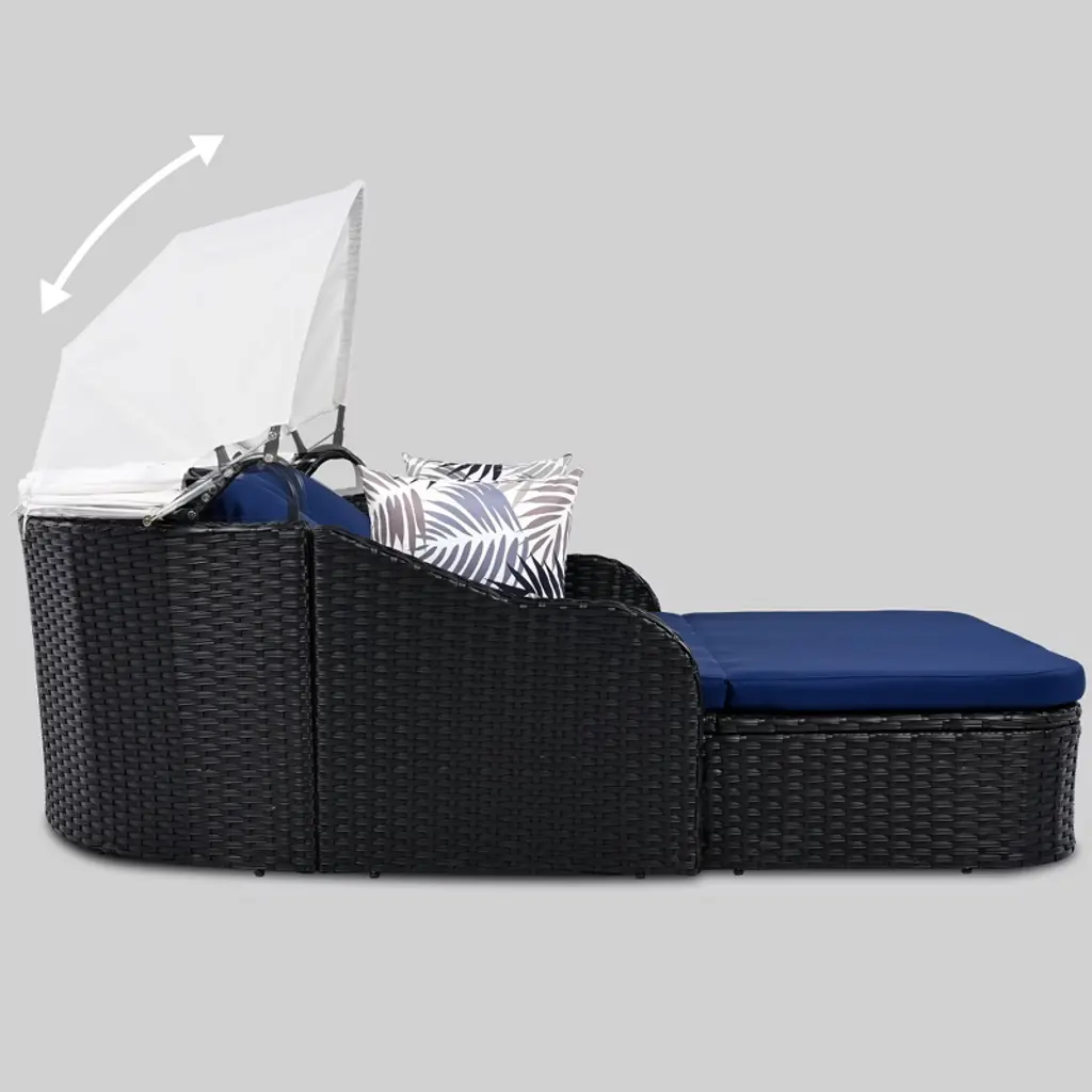 Outdoor Sun Lounger - Relax in Style and Comfort Enjoy the ultimate outdoor relaxation with our Outdoor Sun Lounger, designed for both comfort and style. With its adjustable canopy, elegant curved armrests, and sloped backrest, this sun lounger is perfect for soaking up the sun or unwinding in the shade. Crafted from high-quality PE rattan, it¡¯s durable and built to withstand the elements, ensuring lasting use for your outdoor space. Product Features Adjustable Canopy: The sun lounger comes with an adjustable canopy, providing you with the ability to block out sunlight and enjoy a shaded, comfortable spot to relax.Stylish Curved Armrests: The half-package curved armrests offer both support and elegance, adding a sophisticated touch to the lounger¡¯s design.Sloped Backrest: The lounger features a sloped backrest, designed for maximum comfort as you recline and enjoy the outdoors.Pillows Included: No need to bring extra pillows! This lounger includes two large navy blue pillows and two colorful decorative pillows for added comfort and style.Horn Buckle: The horn buckle connects the cushions to the bottom, preventing them from slipping and ensuring they stay securely in place as you relax. Product Description Crafted with durable PE rattan material, the Outdoor Sun Lounger is perfect for outdoor relaxation. Measuring 79.9 inches in length and 52.4 inches in width, it comfortably accommodates two adults. The adjustable canopy allows you to block out the sun and relax in comfort, while the half-package stylish curved armrests add both elegance and support. The sloped backrest ensures that you can recline and unwind with ease, offering the ultimate in outdoor lounging. Additionally, the lounger comes with two large gray pillows and two colorful decorative pillows, so you can start relaxing right away. Adjustable feet make it easy to set up on any surface, ensuring stability even on uneven ground. Assembly Removable Cushions: YesPillows Included: YesWith Zipper: YesWeight Capacity: 500 lbsAdult Assembly Required: YesAdditional Tools Required: All tools includedAssembly Time: About 1 hour Transform your outdoor space with this stylish and comfortable Outdoor Sun Lounger. It¡¯s perfect for lounging, reading, or napping in the garden, patio, or poolside. Whether you're hosting a gathering or enjoying some peaceful alone time, this sun lounger will be your go-to spot for relaxation.