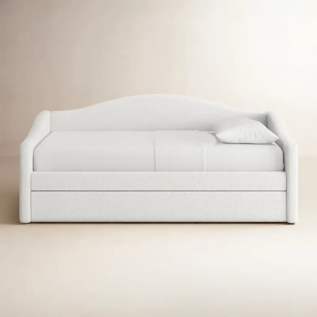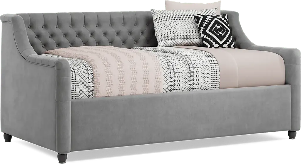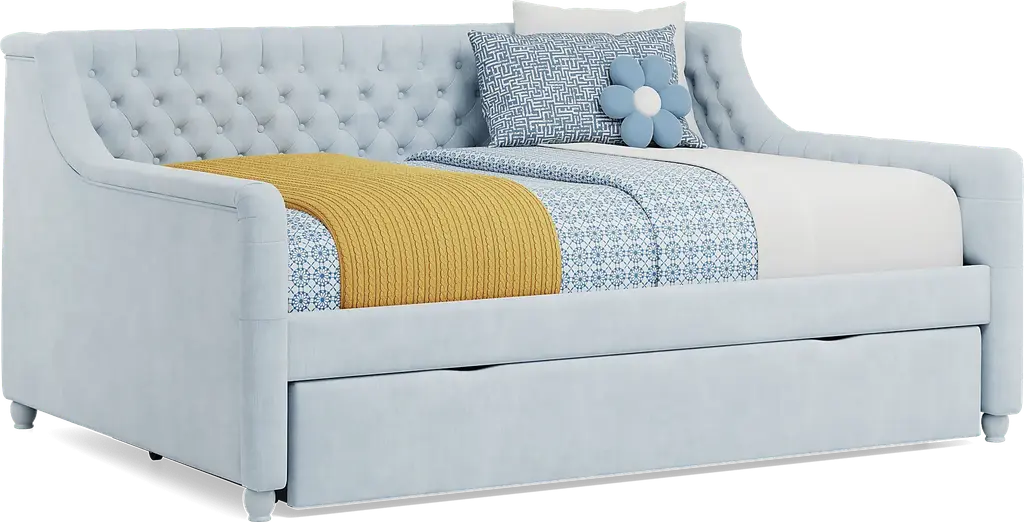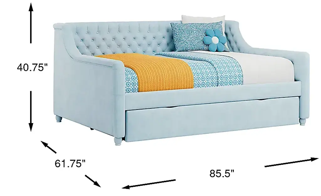 Give the guest room or your child's room the glam treatment! The ultra-chic, super versatile Alena daybed is a wonderful selection, whether you're looking for an extra seat or a bed for an overnight guest. Soft velvet upholstery in an beautiful light blue color is accented with stately tufting along the interior on both the inside back and sides. Gently rounded edges add plenty of panache, giving it a fashionably chic silhouette. The included underbed trundle is perfect for storing seasonal clothes, games, or even an extra mattress. Mattress and foundation (if required) sold separately.