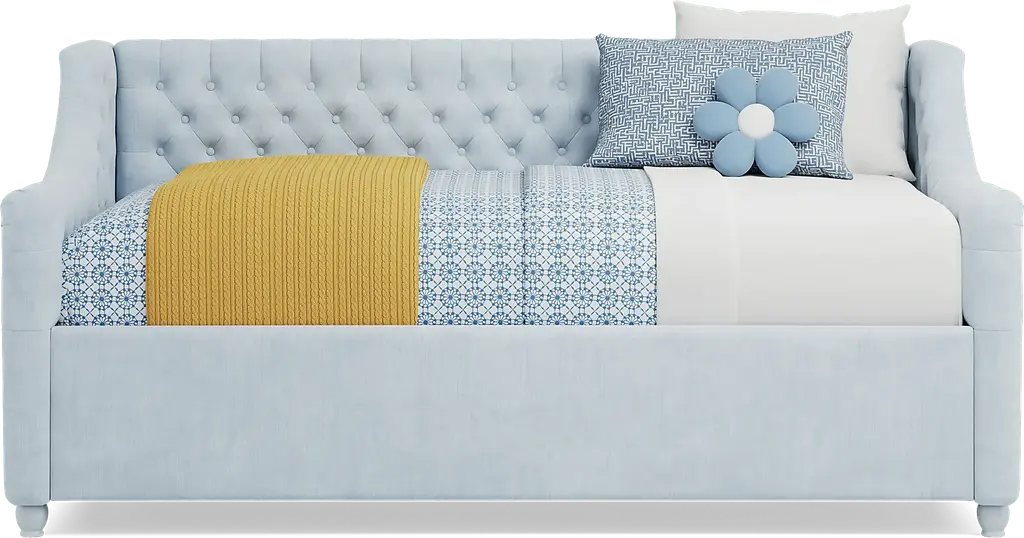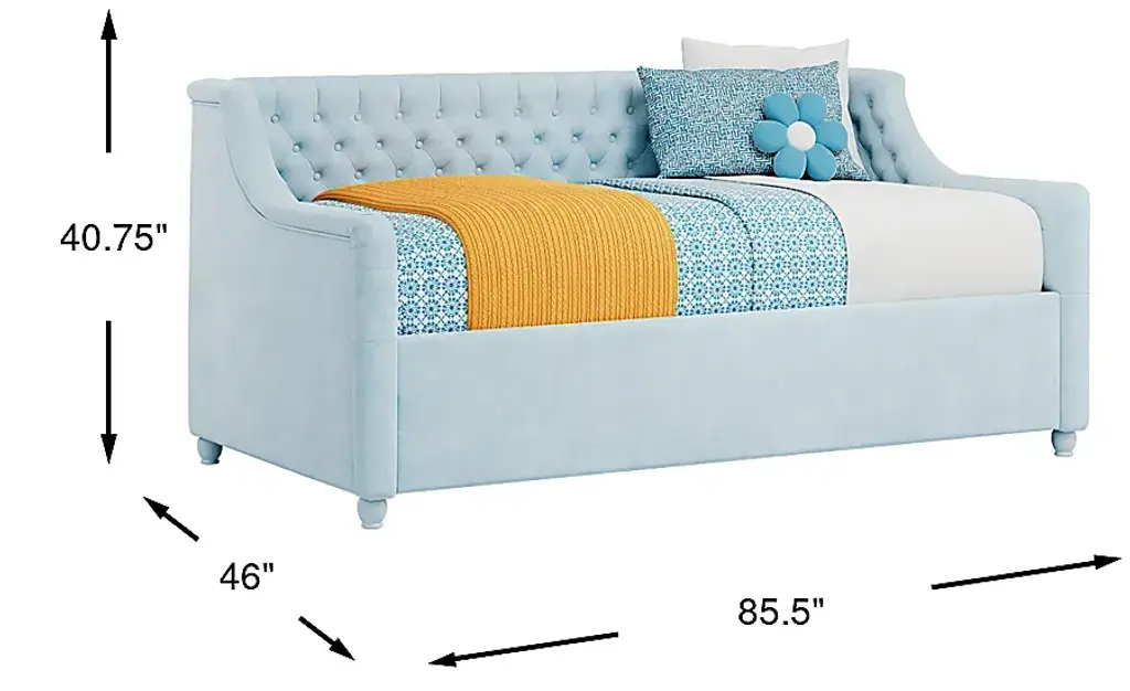 Give the guest room or your child's room the glam treatment! The ultra-chic, super versatile Alena daybed is a wonderful selection, whether you're looking for an extra seat or a bed for an overnight guest. Soft velvet upholstery in a beautiful light blue color is accented with stately tufting along the interior on both the inside back and sides. Gently rounded edges add plenty of panache, giving it a fashionably chic silhouette. Mattress and foundation (if required) sold separately.