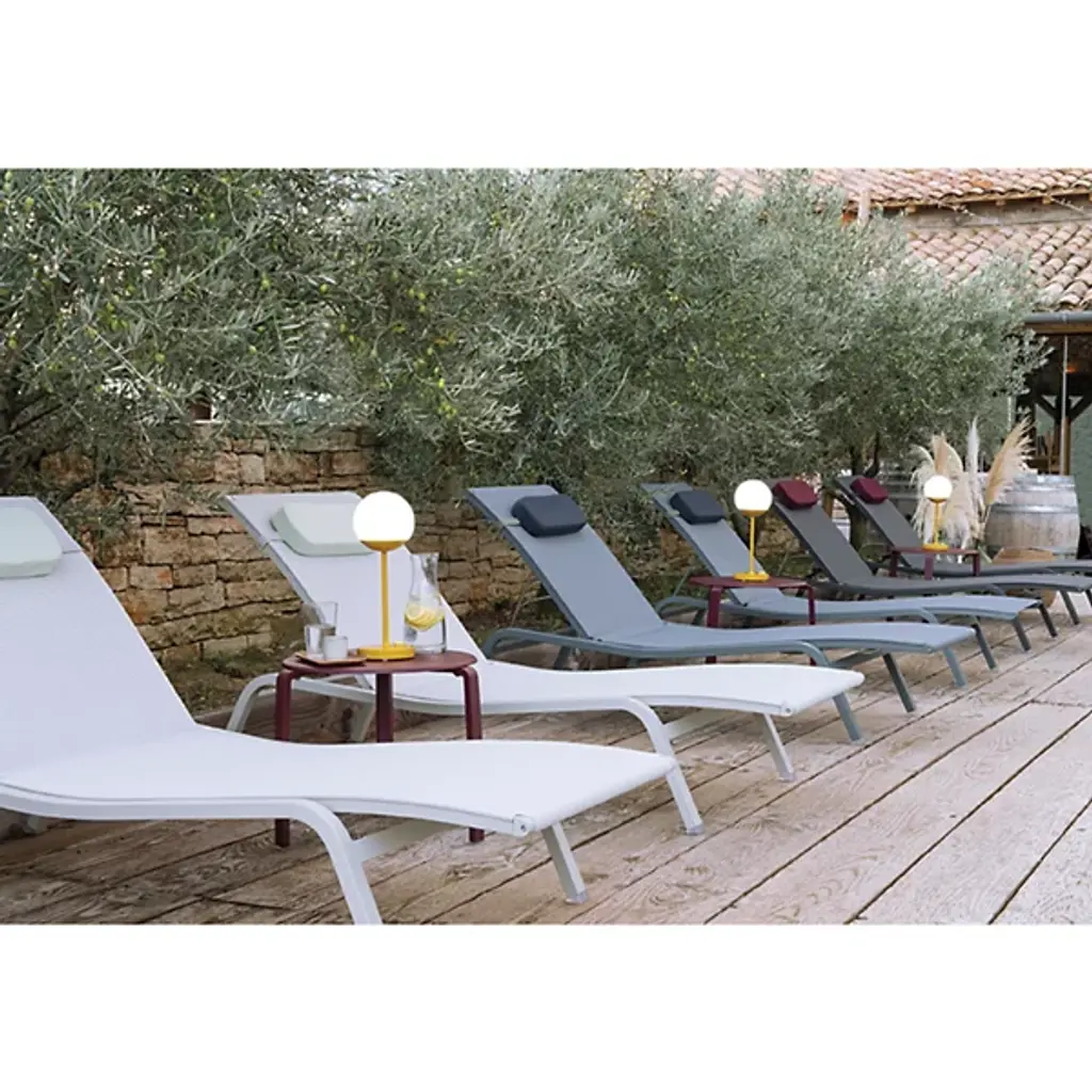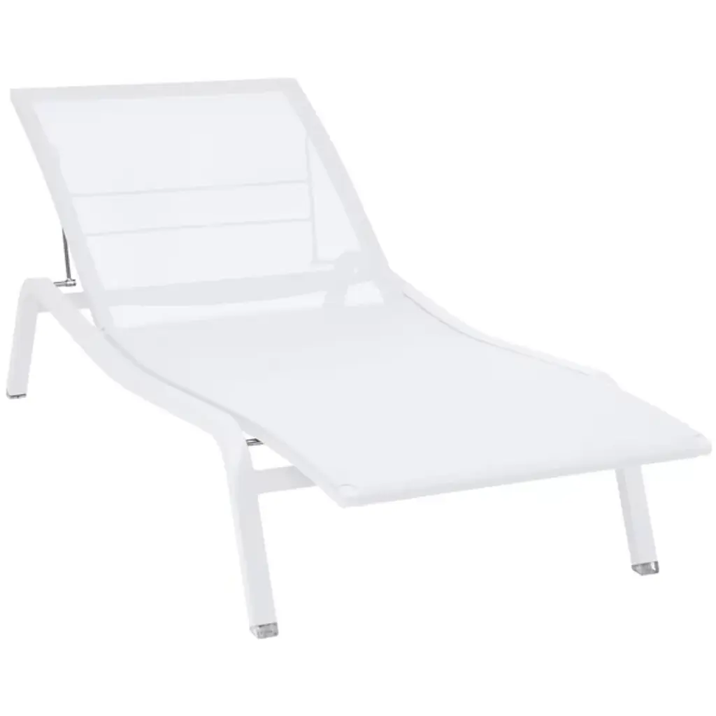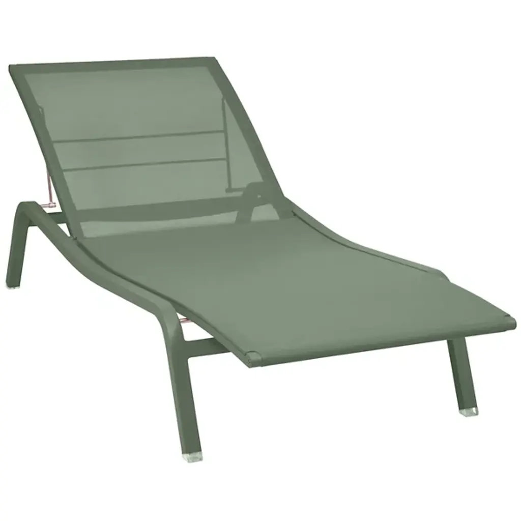 The Fermob Alize Stackable Sunlounger takes its name from the French word for tradewind. It is suitably light and airy, with a clean aluminum frame topped by translucent Outdoor Technical Fabric (OTF, a durable and comfortable material made of polyester coated with PVC). Both the backrest and footrest are adjustable for customizable lounging and relaxation. Stackable up to 15 high.
