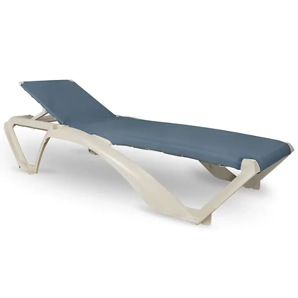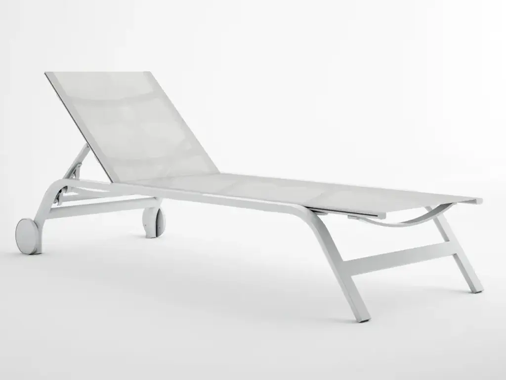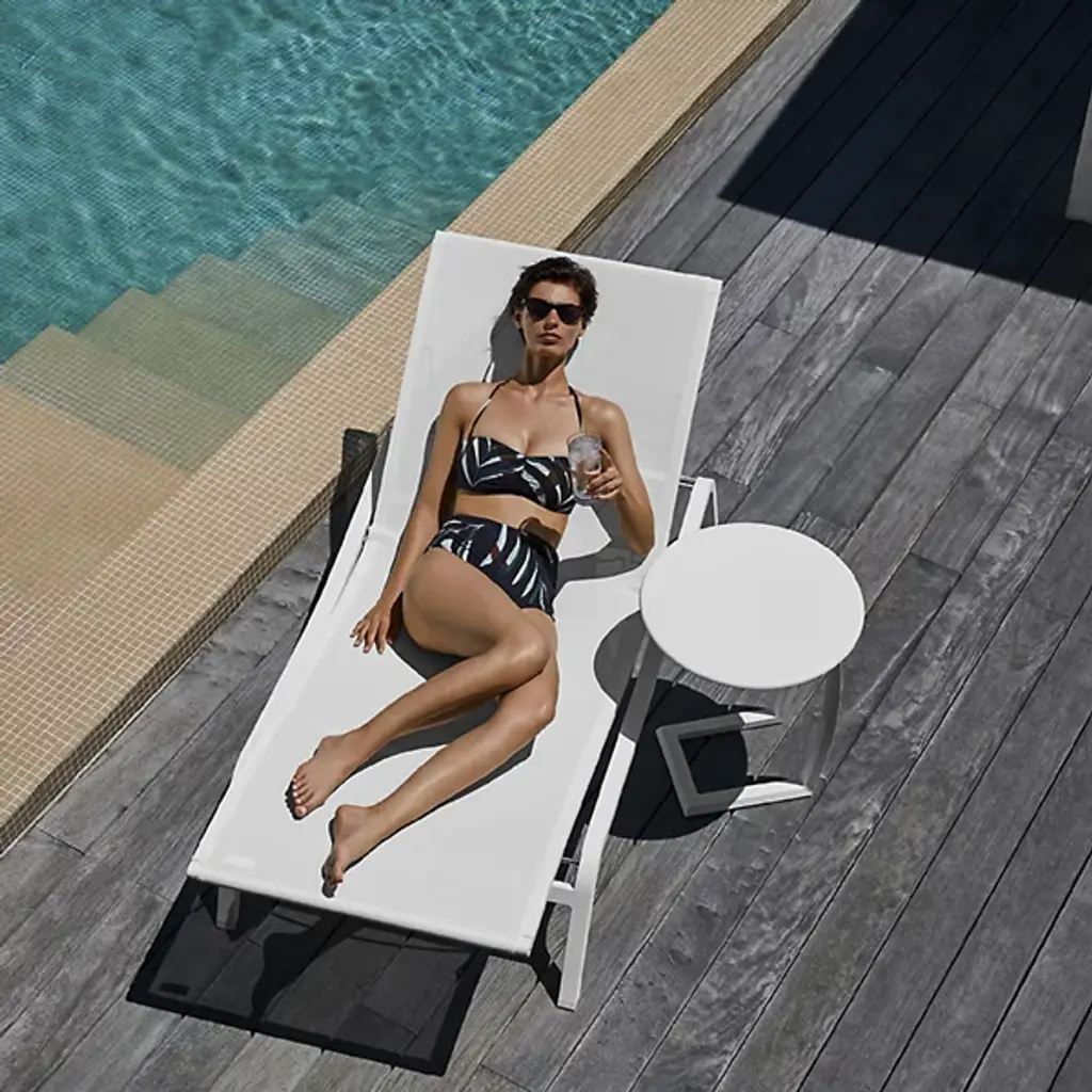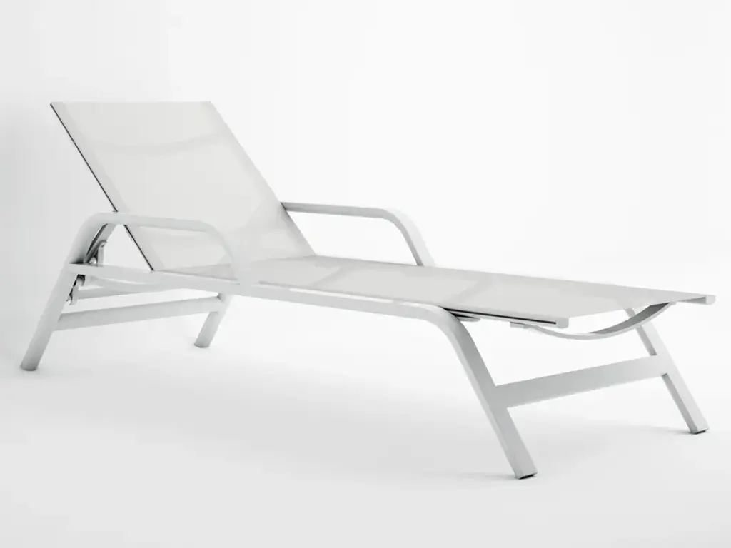 The Fermob Alize Stackable Sunlounger takes its name from the French word for tradewind. It is suitably light and airy, with a clean aluminum frame topped by translucent Outdoor Technical Fabric (OTF, a durable and comfortable material made of polyester coated with PVC). Both the backrest and footrest are adjustable for customizable lounging and relaxation. Stackable up to 15 high.