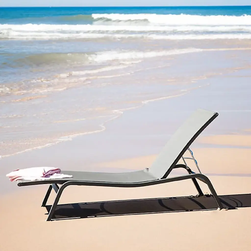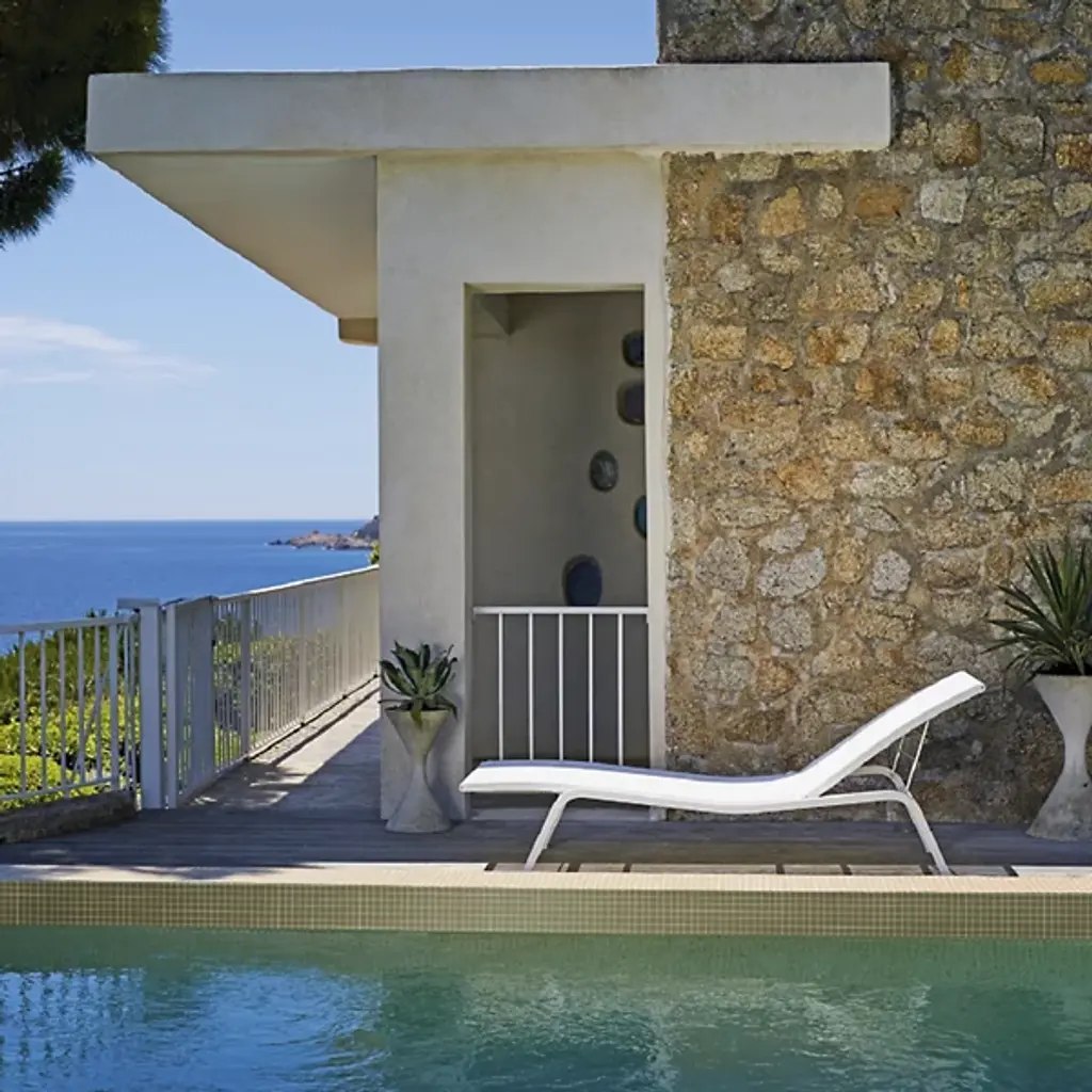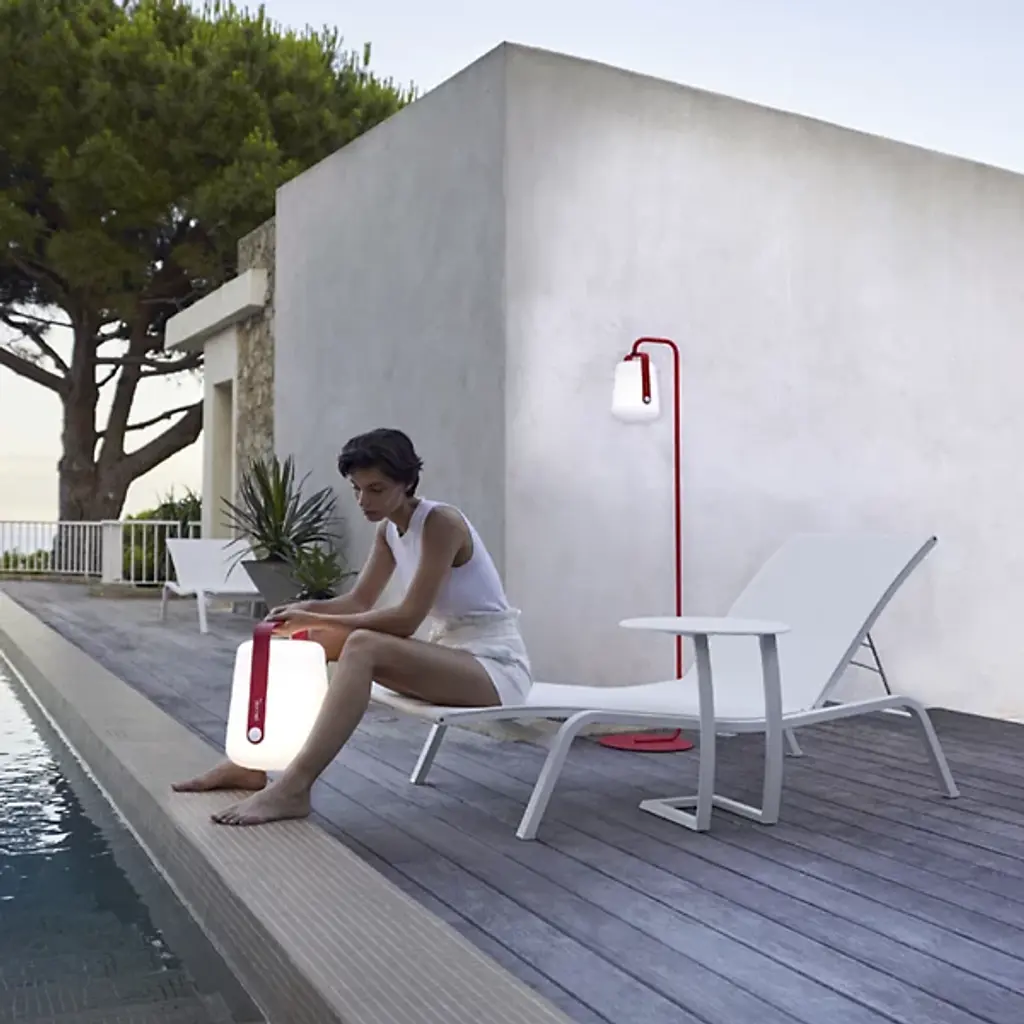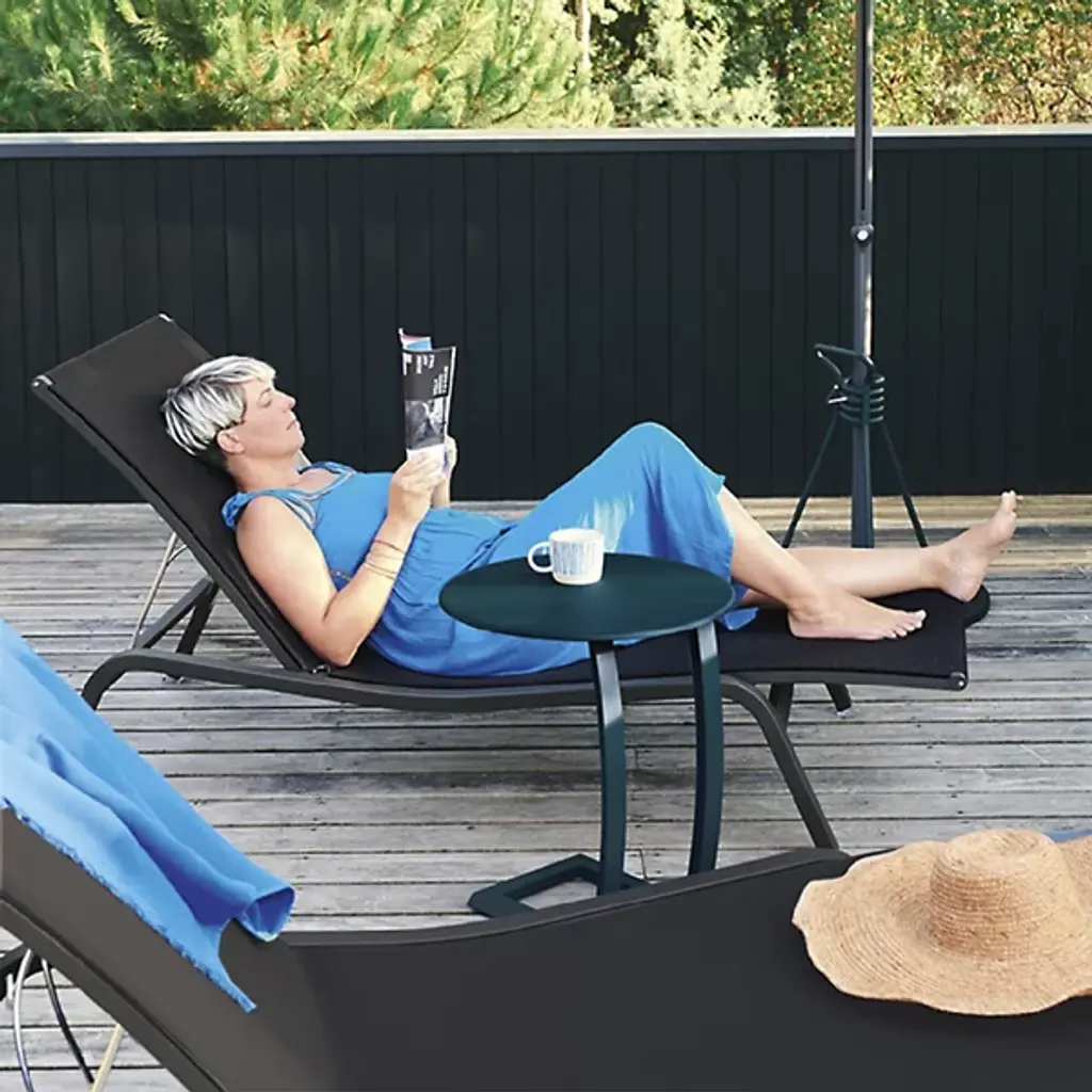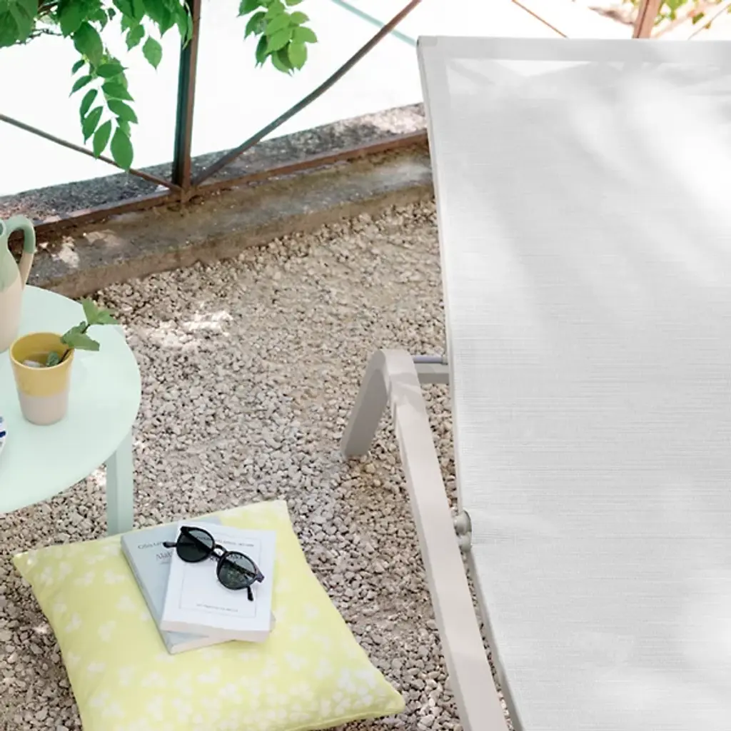 The Fermob Alize Stackable Sunlounger takes its name from the French word for tradewind. It is suitably light and airy, with a clean aluminum frame topped by translucent Outdoor Technical Fabric (OTF, a durable and comfortable material made of polyester coated with PVC). Both the backrest and footrest are adjustable for customizable lounging and relaxation. Stackable up to 15 high.