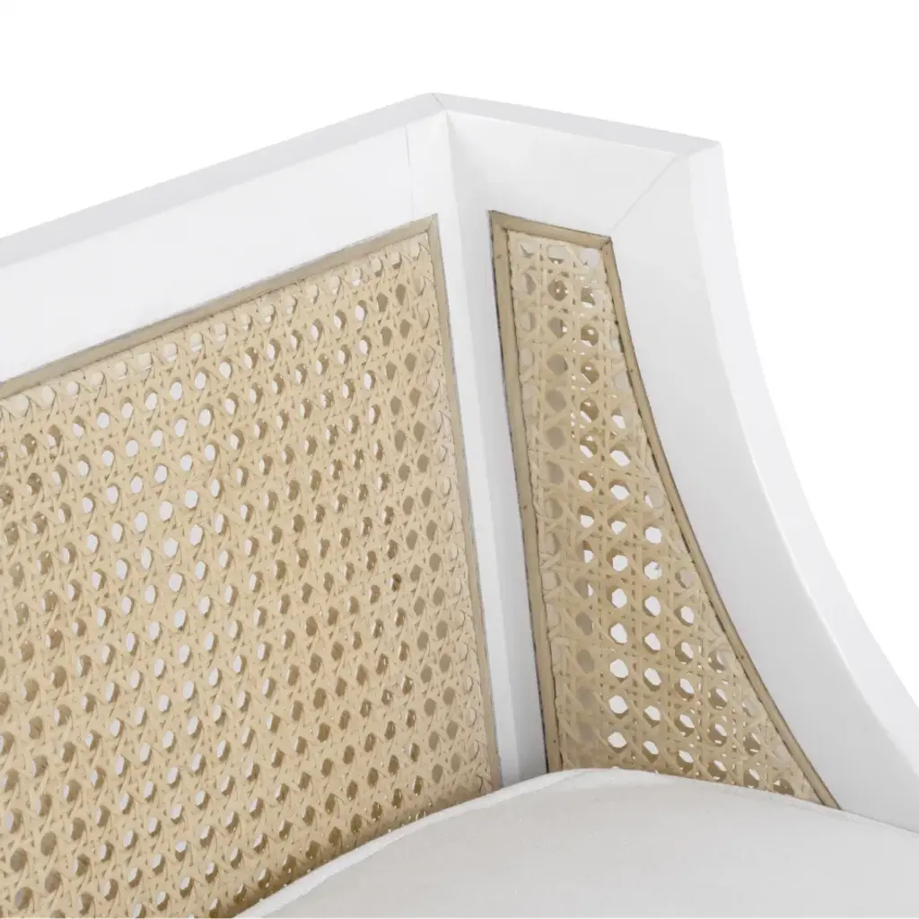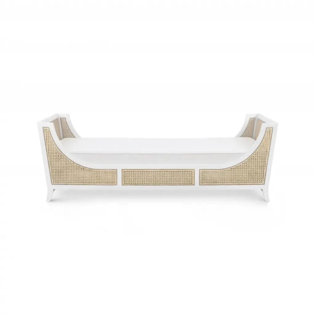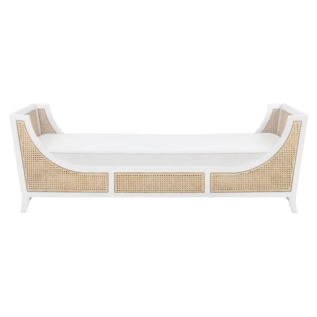 A contemporary interpretation of English Regency design, the Alyssa Daybed will have your guests swooning. This elegant piece is composed of Vanilla Pigmented Lacquered Wood with Bleached Cane woven in a traditional octagonal pattern. The piece comes with a large cushion, the size of a twin mattress, with a natural linen cover. Perfect for a salon living room, or a room that turns into a bedroom in a pinch. This gorgeous daybed will add an effortless and regal element to your space.